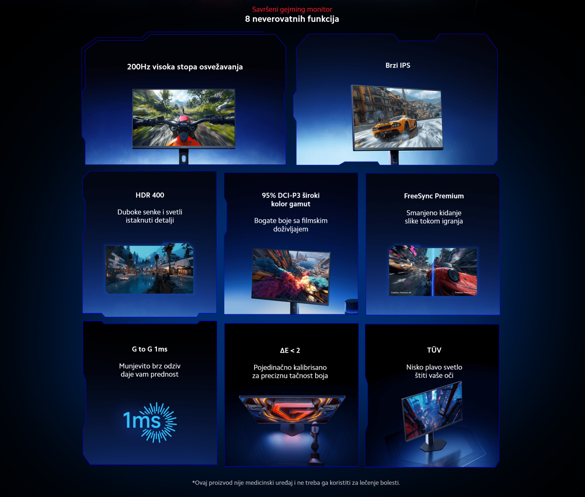 *Ovaj proizvod podržava maksimalnu rezoluciju od 1920 × 1080 sa brzinom osvežavanja do 200Hz. Za optimalne performanse, koristite priloženi HDMI kabl za povezivanje sa HDMI portom. Ako rezolucija ili brzina osvežavanja ne dostignu optimalnu vrednost kada koristite drugi HDMI kabl, proverite sa dobavljačem da li kabl ili izvor signala podržava maksimalne specifikacije.