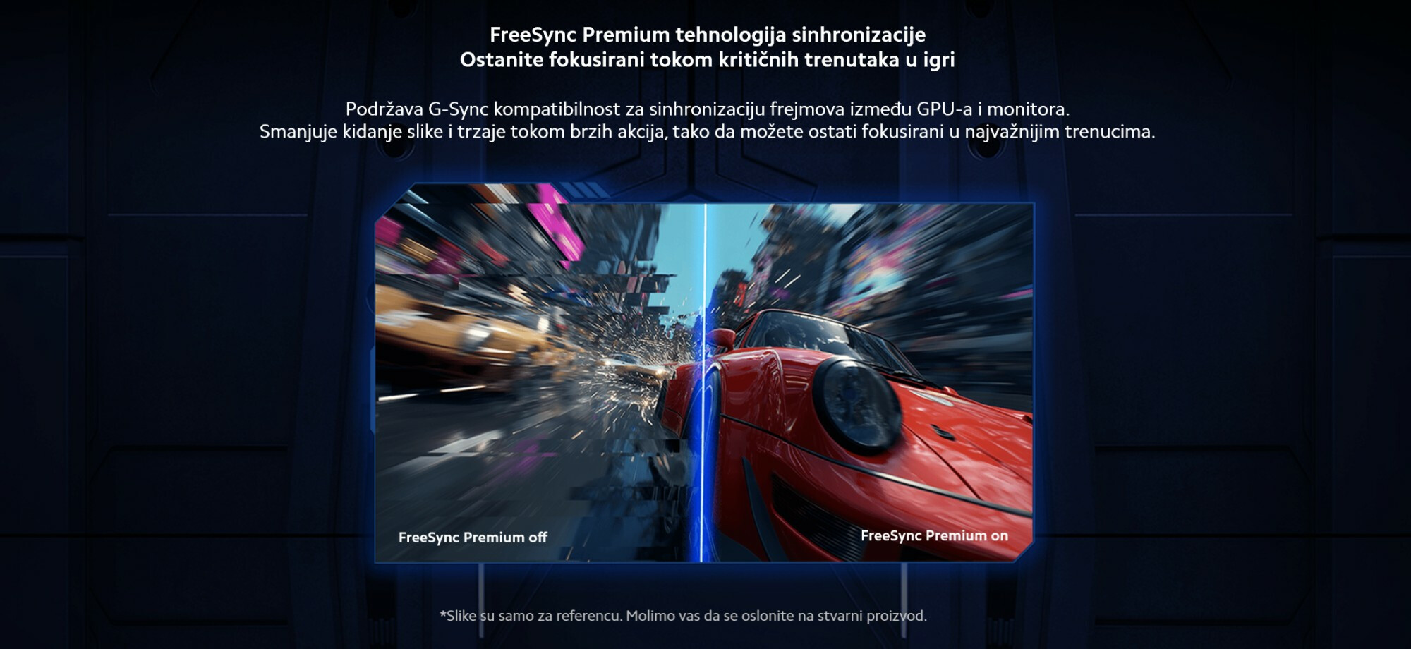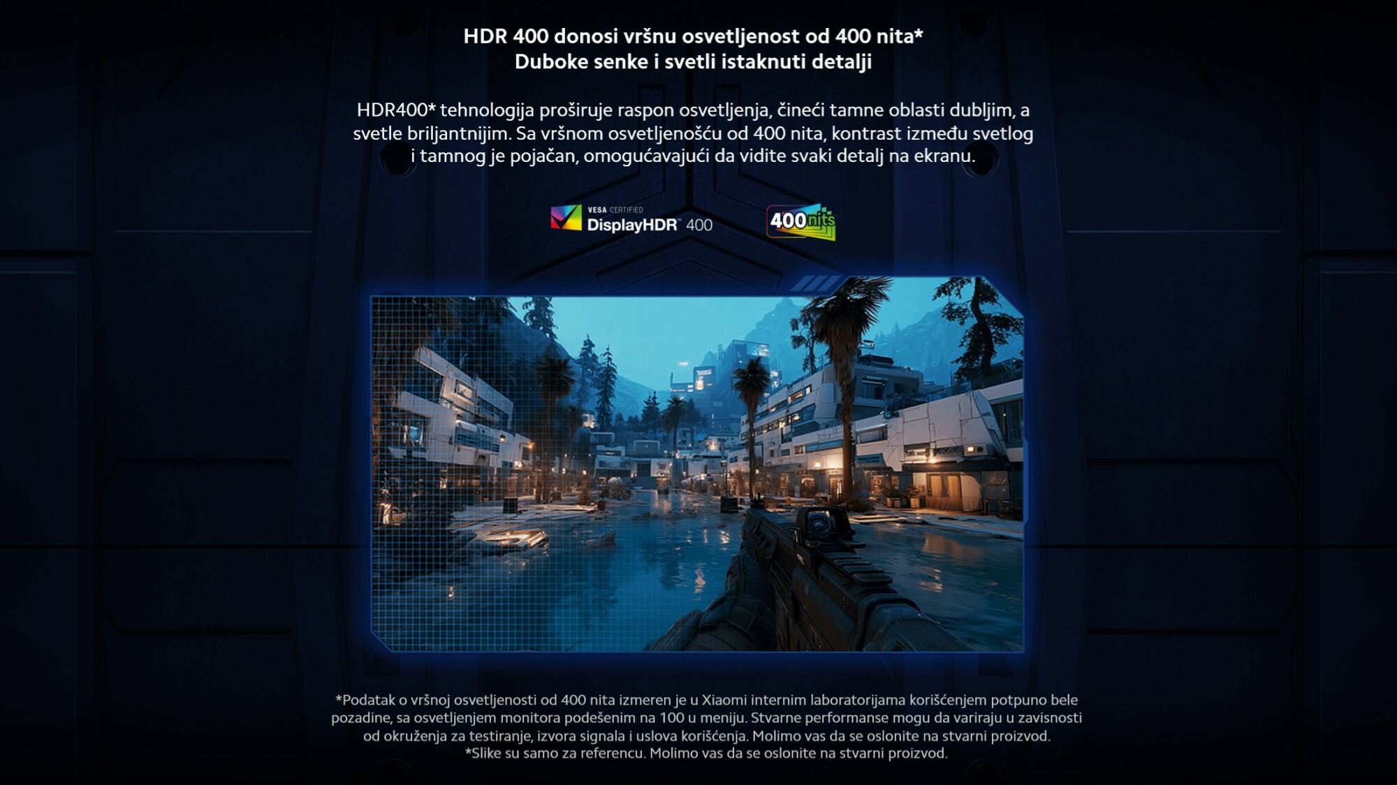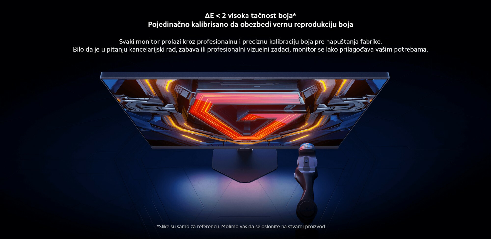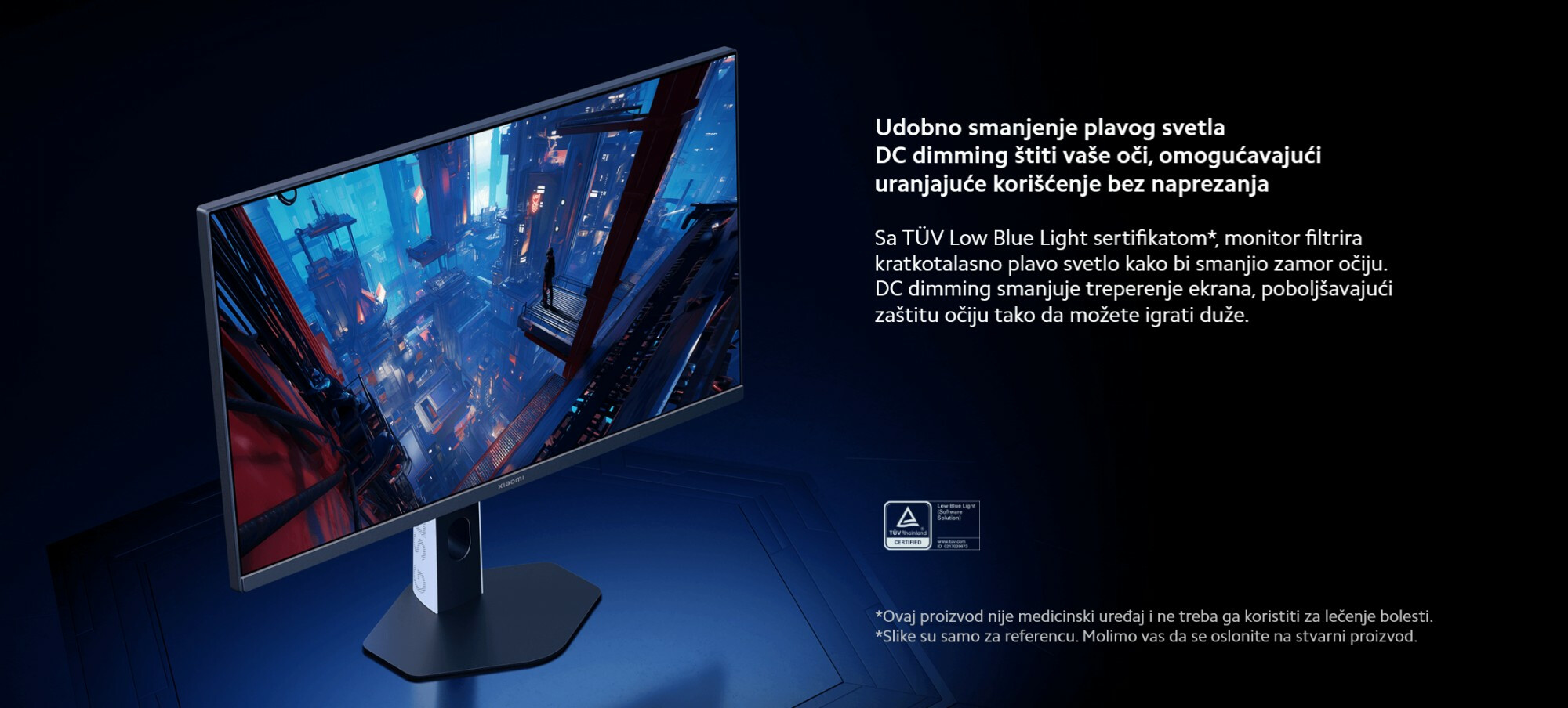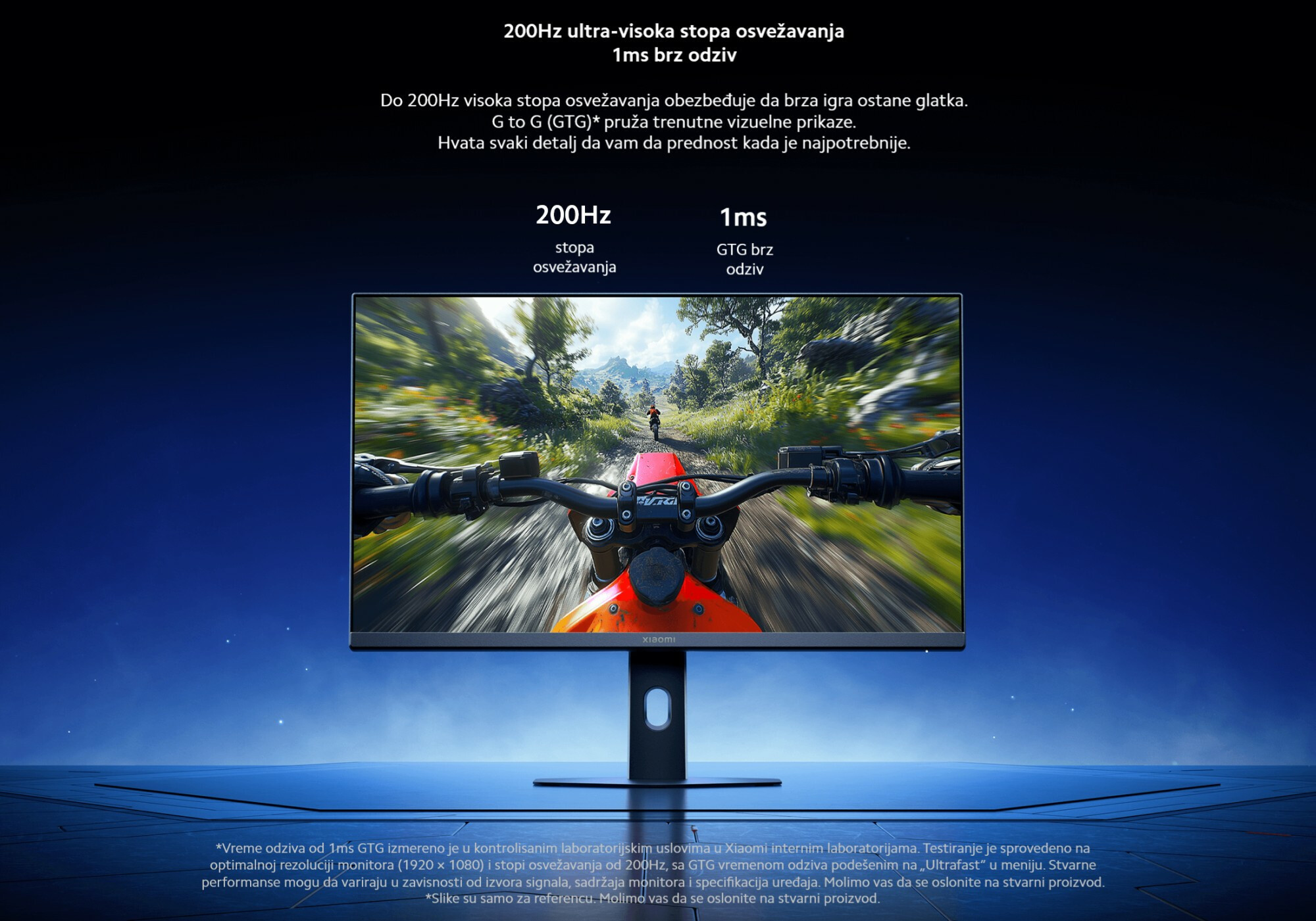 *Vreme odziva GTG od 1ms je mereno u kontrolisanim laboratorijskim uslovima u Xiaomi Internal Labs. Testiranje je sprovedeno pri optimalnoj rezoluciji i brzini osvežavanja monitora, sa vremenom odziva GTG podešenim na „Ultrabrzo“ u meniju. Stvarne performanse mogu varirati u zavisnosti od izvora signala, sadržaja monitora i specifikacija uređaja. Molimo pogledajte stvarni proizvod.