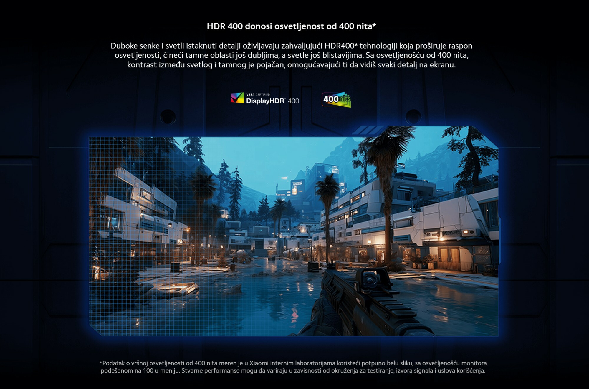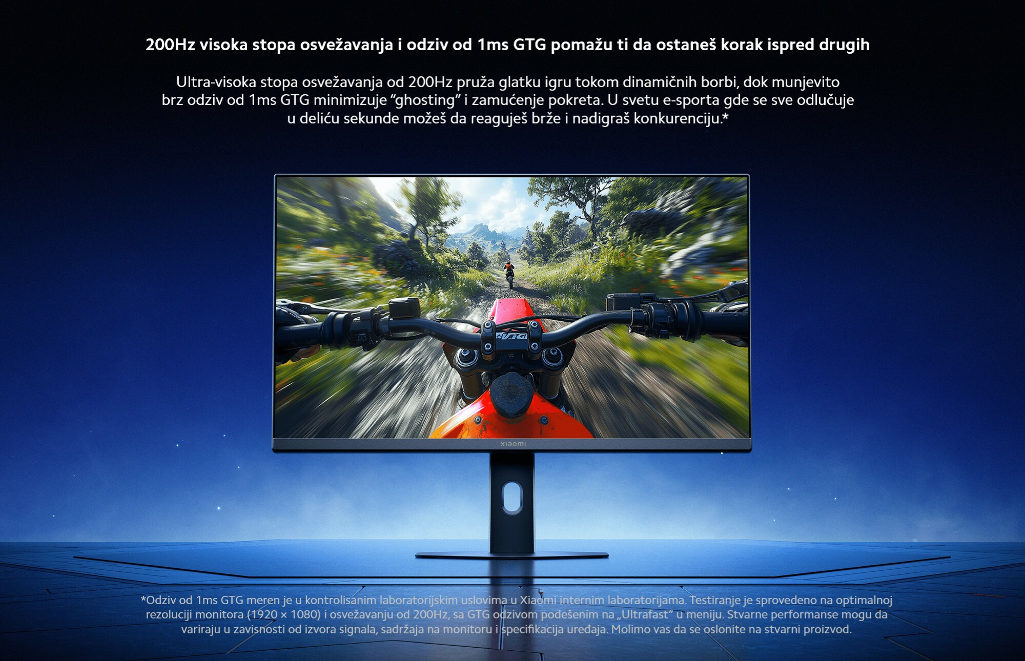 *Vreme odziva od 1ms GTG izmereno je u kontrolisanim laboratorijskim uslovima u Xiaomi internim laboratorijama. Testiranje je sprovedeno na optimalnoj rezoluciji i stopi osvežavanja monitora, sa GTG odzivom podešenim na „Ultrafast“ u meniju. Stvarne performanse mogu da variraju u zavisnosti od izvora signala, sadržaja na monitoru i specifikacija uređaja. Molimo vas da se oslonite na stvarni proizvod.