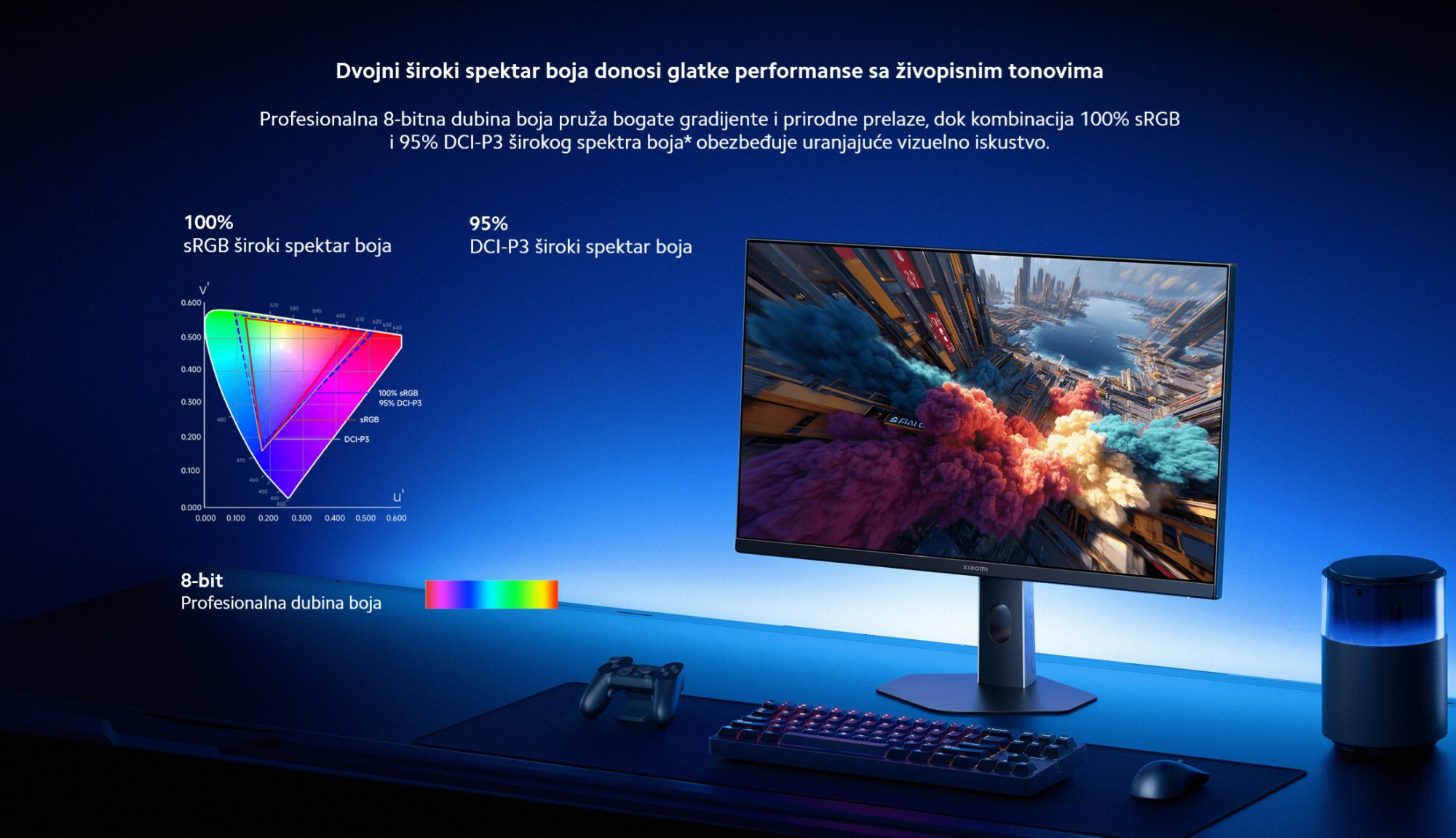 *100% sRGB široki spektar boja: odnosi se na 100% pokrivenost sRGB spektra boja izračunatu na osnovu CIE 1976 standarda kolor prostora. 95% DCI-P3 široki spektar boja: odnosi se na 95% pokrivenost DCI-P3 spektra boja izračunatu na osnovu CIE 1976 standarda kolor prostora.