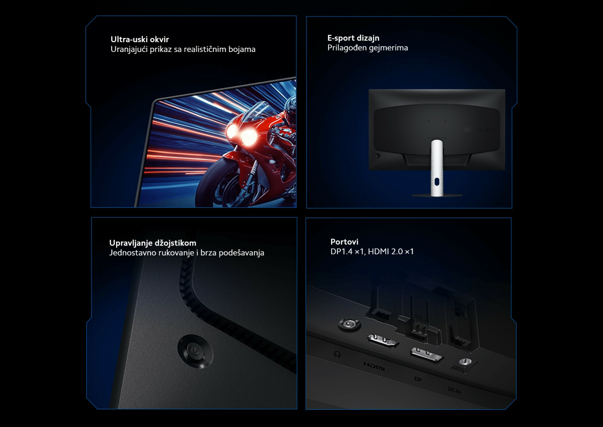 *Ovaj proizvod podržava maksimalnu rezoluciju od 1920 × 1080 pri osvežavanju do 200Hz. Za optimalne performanse koristite priloženi HDMI kabl za povezivanje na HDMI port. Ako rezolucija ili stopa osvežavanja ne dostignu optimalnu vrednost pri korišćenju drugog HDMI kabla, proverite kod dobavljača da li kabl ili izvor signala podržavaju maksimalne specifikacije.