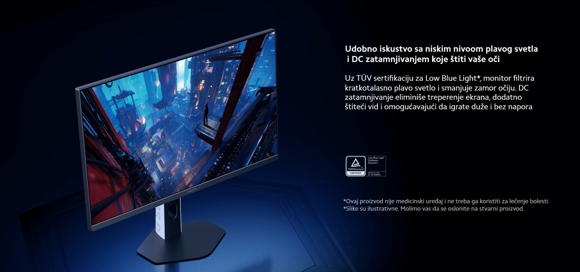 *Low Blue Light sertifikacija: Sertifikovano od strane TÜV, ID: 0217009673. Da biste aktivirali Low Blue Light režim, ručno ga uključite u OSD meniju izborom Picture Mode > Select Mode > Low Blue Light Mode.