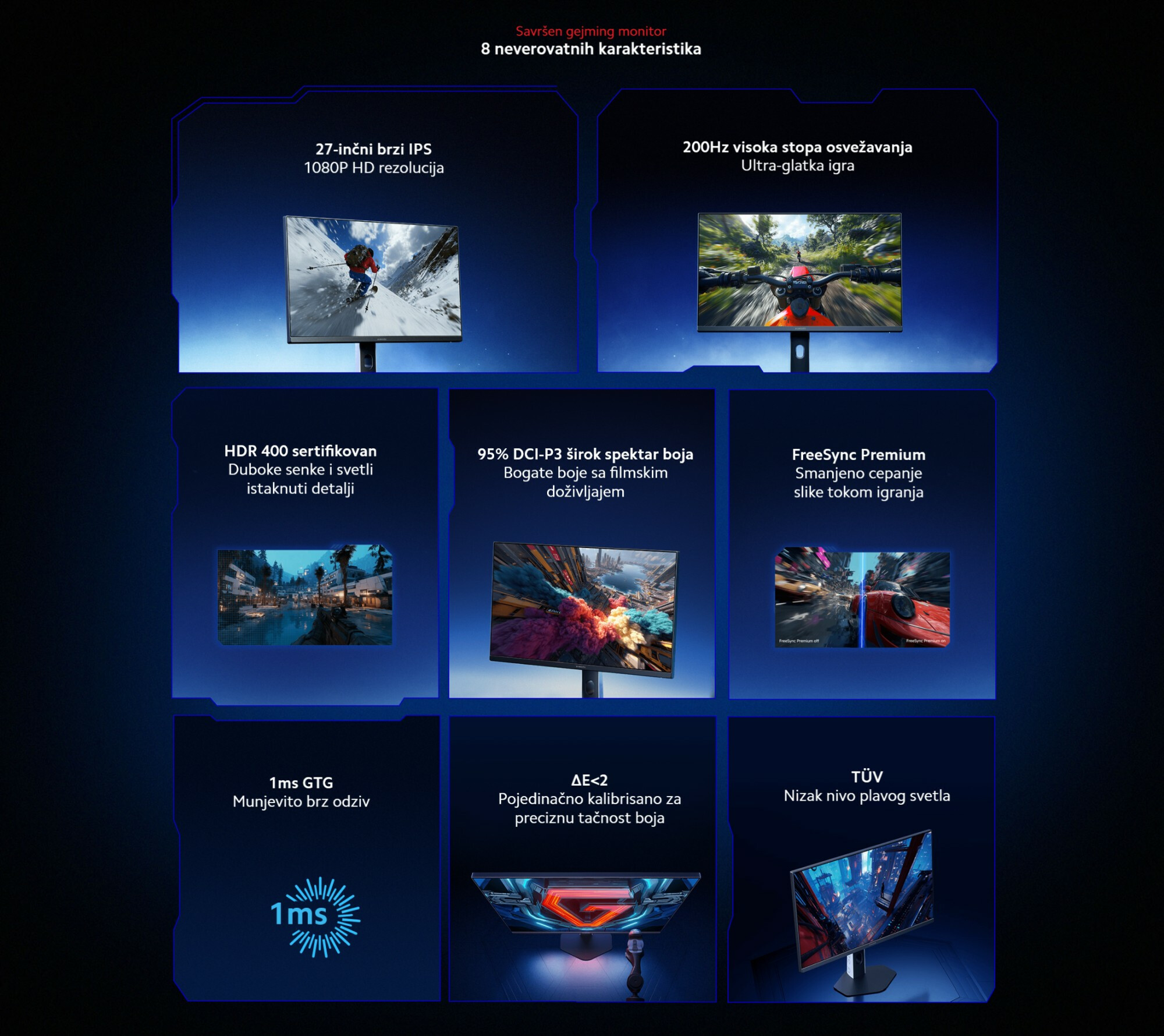 *ΔE<2 profesionalni standard boja: ΔE<2 predstavlja prosečnu vrednost razlike u boji koju ljudsko oko percipira u uniformnom kolor prostoru. Ona kvantifikuje tačnost reprodukcije boja. Što je vrednost manja, to je distorzija boja manja. Svaki monitor se kalibriše za sRGB režim tokom proizvodnje. Da biste aktivirali režim širokog spektra boja, ručno izaberite Picture Mode/Game Mode > Colour Space > sRGB u OSD meniju.
