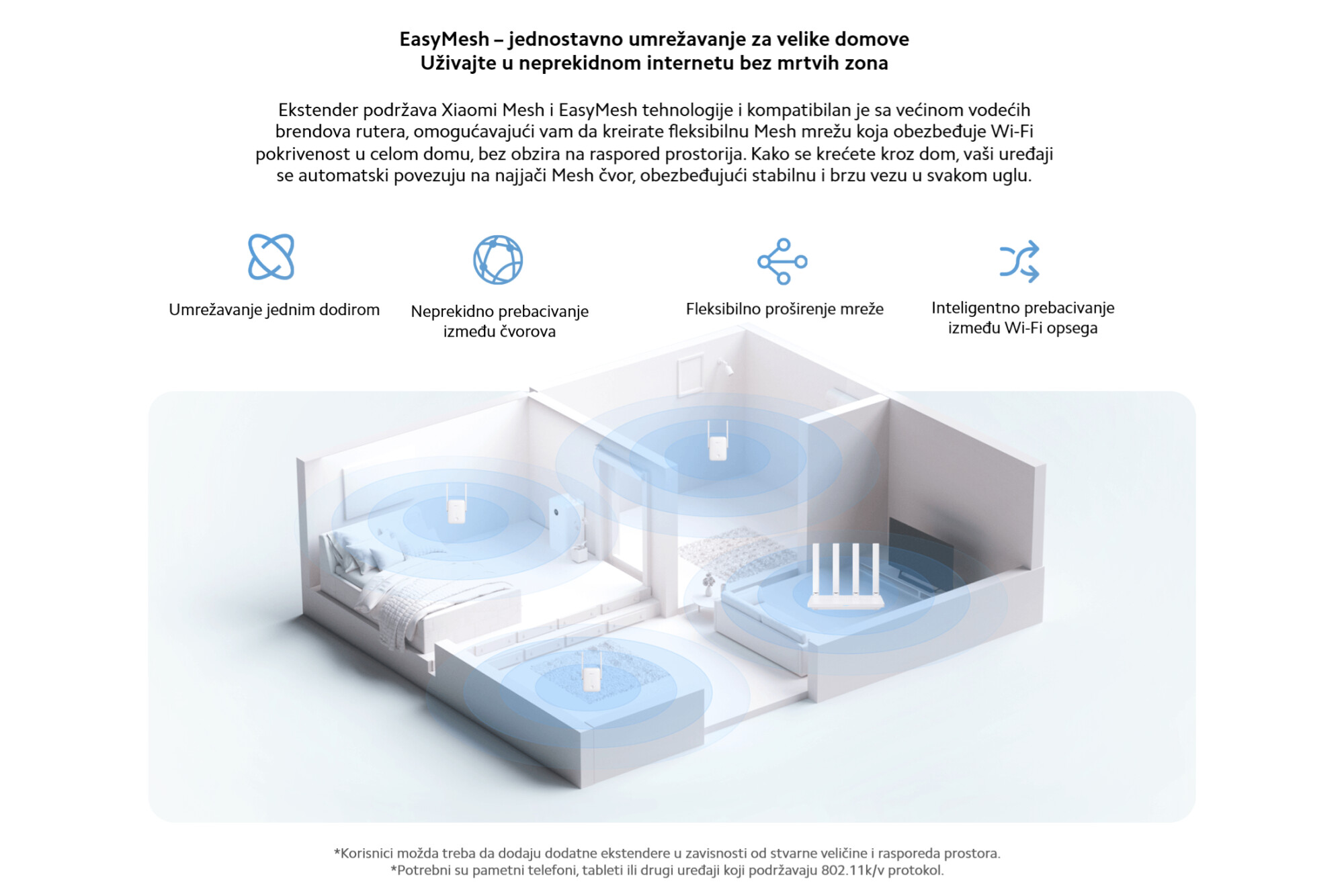 | Dodatne informacije | Aplikacija: Xiaomi Home; Režimi: - Režim proširivača dometa, Meš režim, Režim pristupne tačke (AP) |