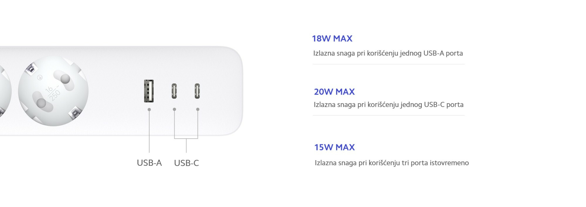 | Portovi | USB-C1/C2: 5.0V⎓3.0A 15.0W Max. 9.0V⎓2.22A 20.0W Max. 12.0V⎓1.67A 20.0W Max.; USB-A: 5.0V⎓3.0A 15.0W Max. 9.0V⎓ 2.0A 18.0W Max. 12.0V⎓ 1.5A 18.0W Max. |