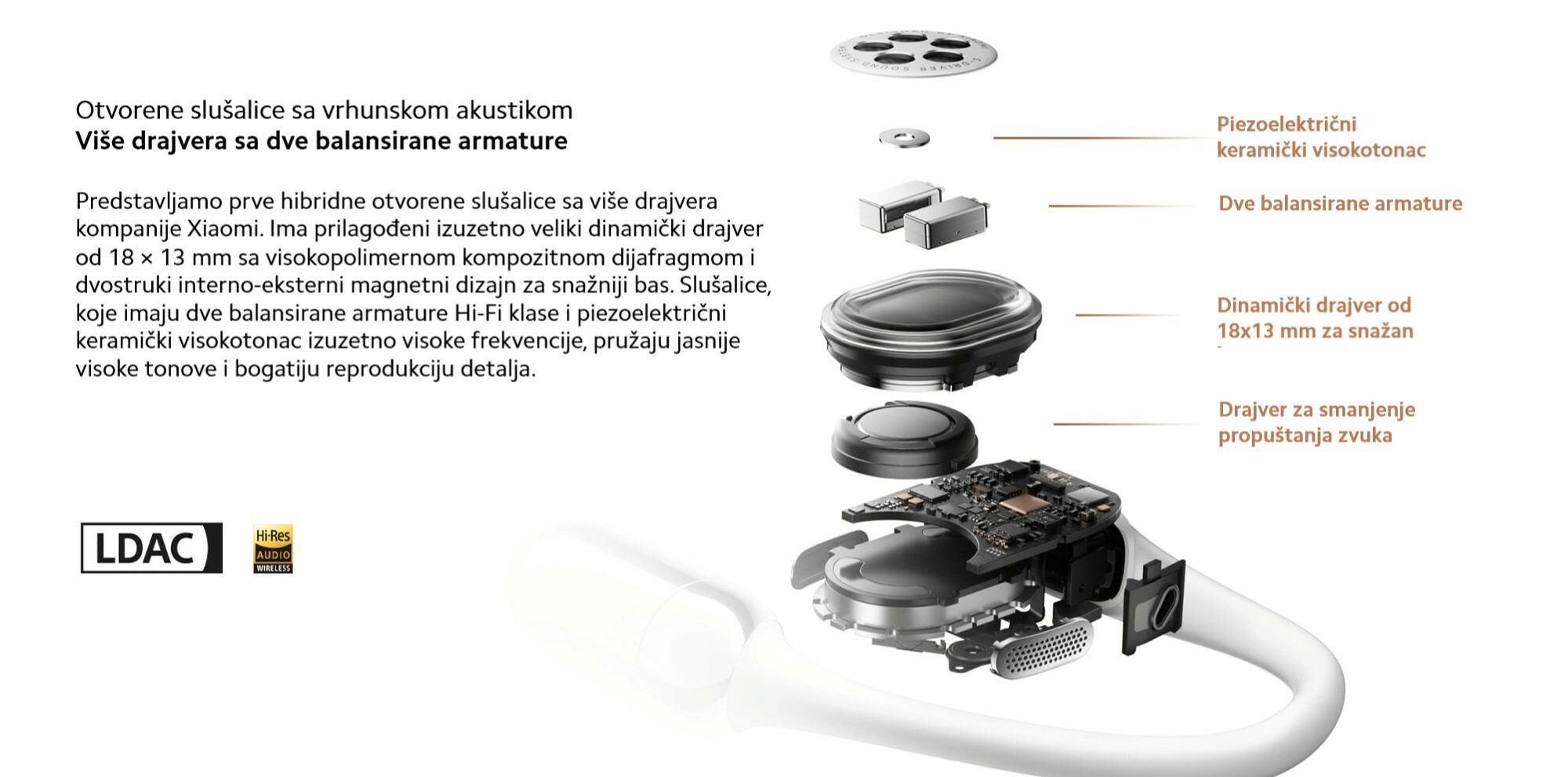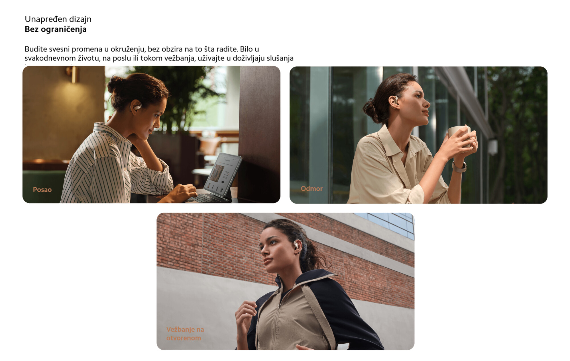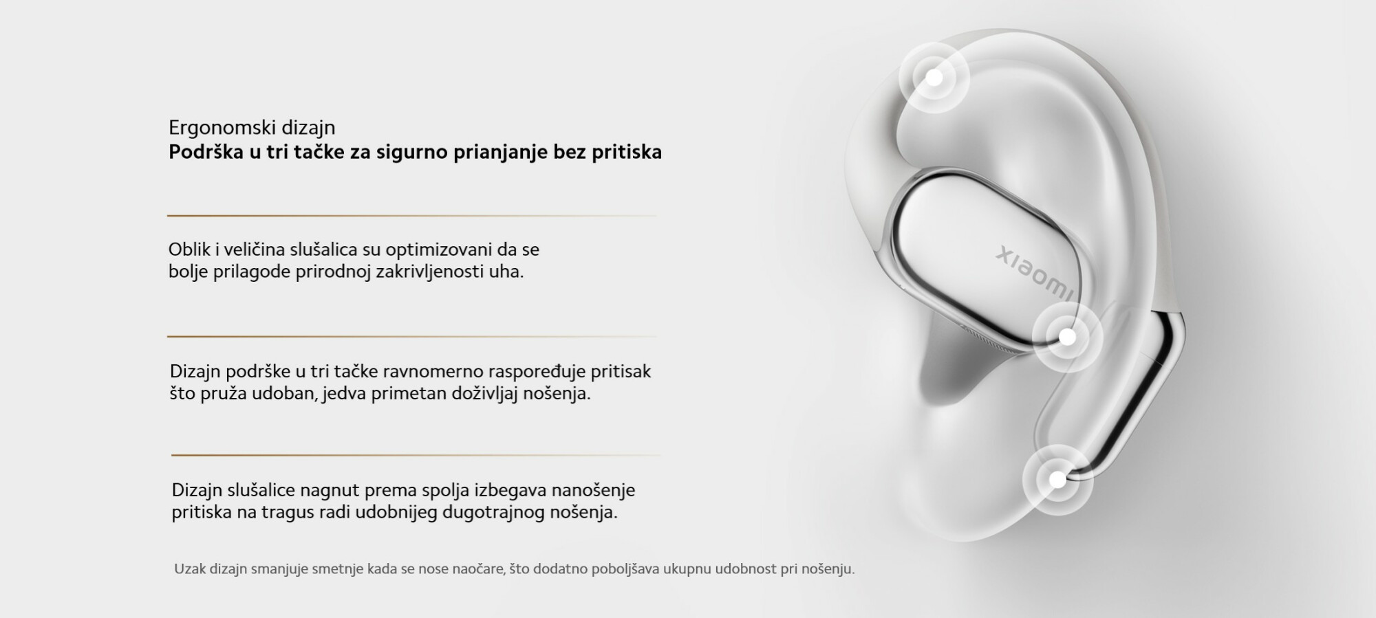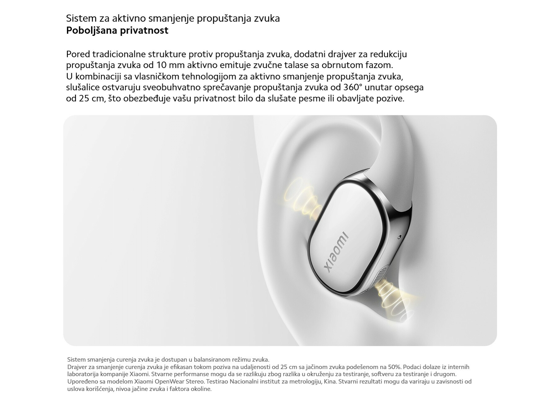 *Upoređeno sa modelom Xiaomi OpenWear Stereo. Testirao Nacionalni institut za metrologiju, Kina. Stvarni rezultati mogu da variraju u zavisnosti od uslova korišćenja, nivoa jačine zvuka i faktora okoline.