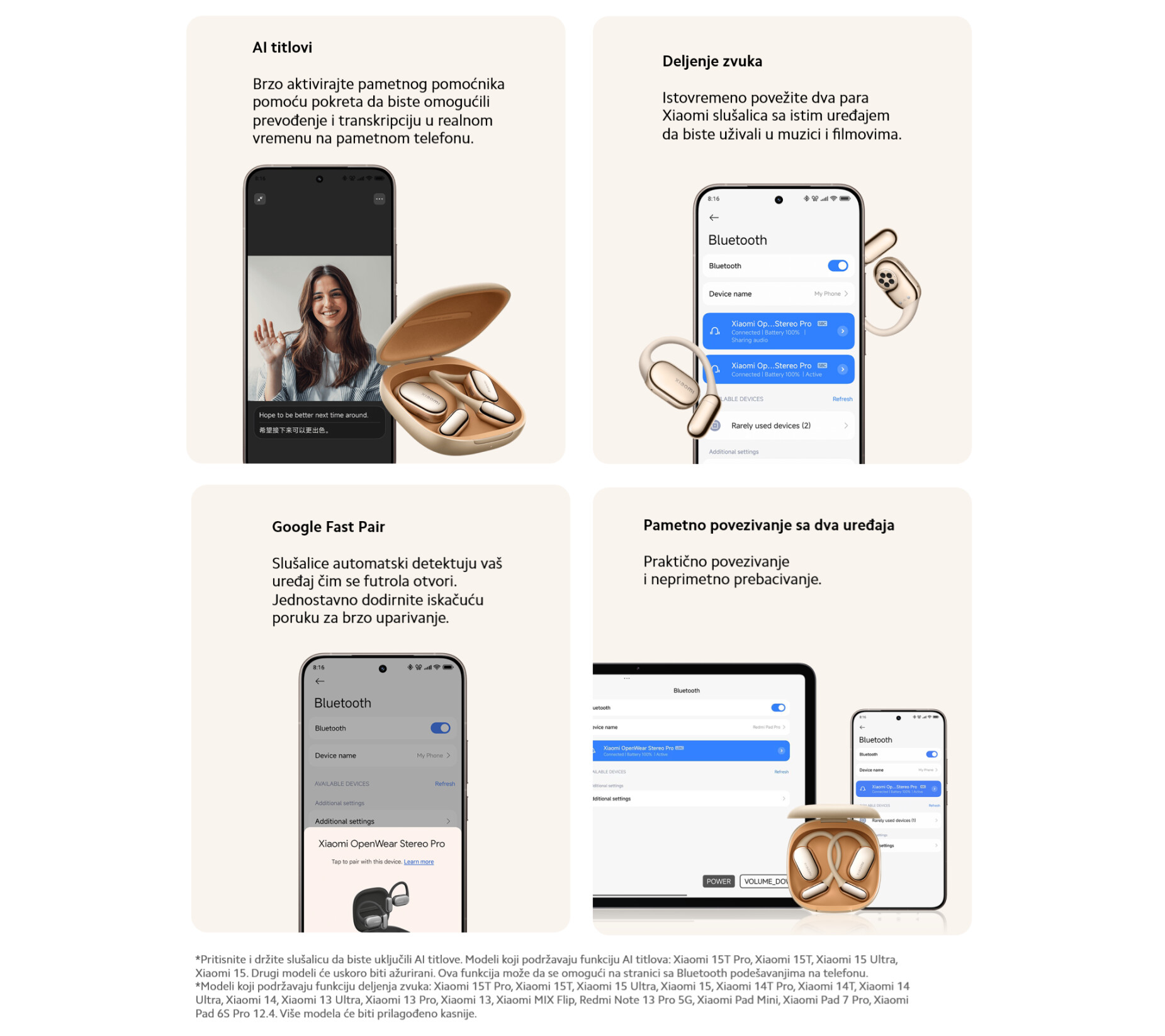 *Modeli koji podržavaju funkciju deljenja zvuka: Xiaomi 15T Pro, Xiaomi 15T, Xiaomi 15 Ultra, Xiaomi 15, Xiaomi 14T Pro, Xiaomi 14T, Xiaomi 14 Ultra, Xiaomi 14, Xiaomi 13 Ultra, Xiaomi 13 Pro, Xiaomi 13, Xiaomi MIX Flip, Redmi Note 13 Pro 5G, Xiaomi Pad Mini, Xiaomi Pad 7 Pro, Xiaomi Pad 6S Pro 12.4. Više modela će biti prilagođeno kasnije.