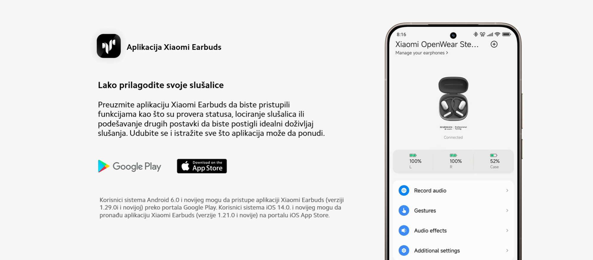 *Korisnici sistema Android 6.0 i novijeg mogu da pristupe aplikaciji Xiaomi Earbuds (verziji 1.29.0i i novijoj) preko portala Google Play. Korisnici sistema iOS 14.0. i novijeg mogu da pronađu aplikaciju Xiaomi Earbuds (verzije 1.21.0 i novije) na portalu iOS App Store.