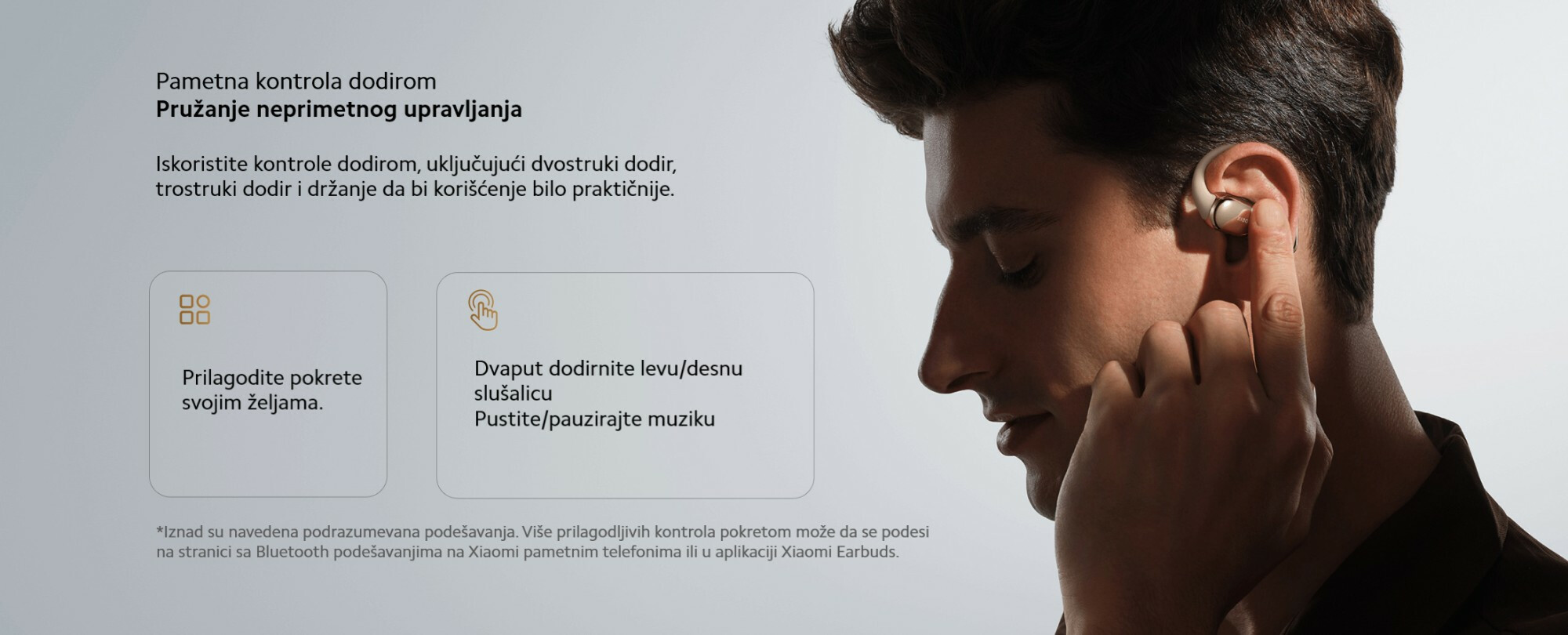 *Iznad su navedena podrazumevana podešavanja. Više prilagodljivih kontrola pokretom može da se podesi na stranici sa Bluetooth podešavanjima na Xiaomi pametnim telefonima ili u aplikaciji Xiaomi Earbuds.