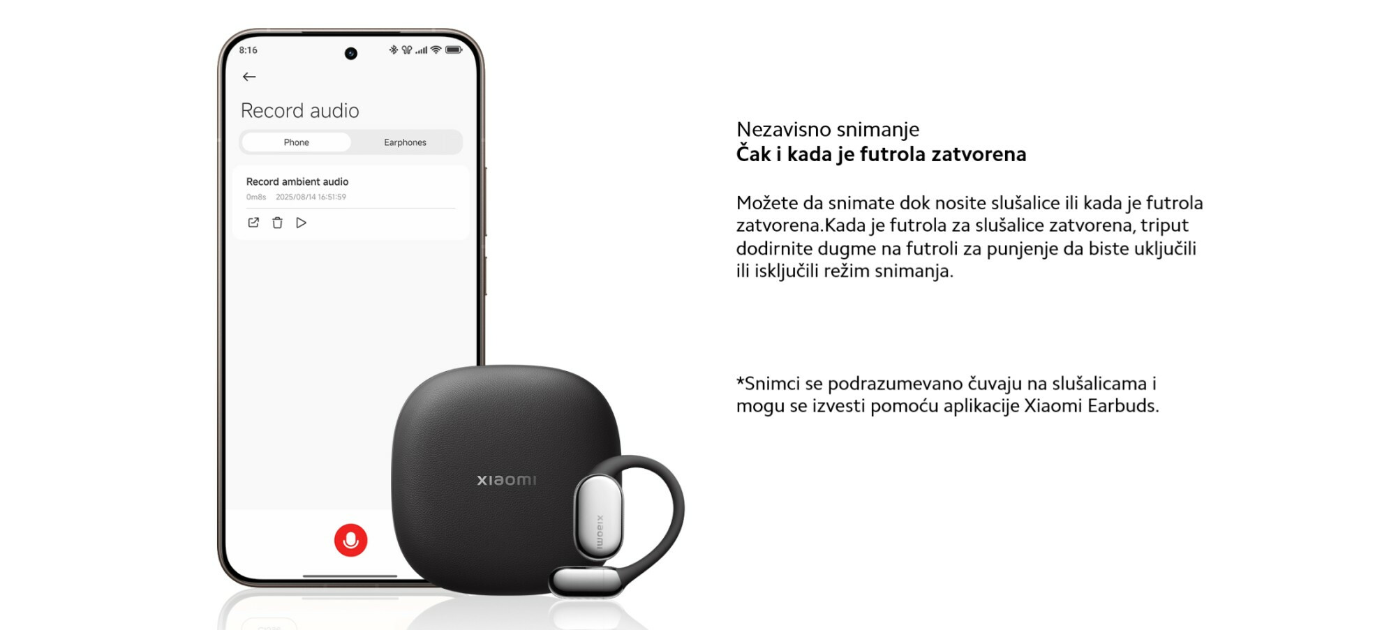 *Snimci se podrazumevano čuvaju na slušalicama i mogu se izvesti pomoću aplikacije Xiaomi Earbuds.
