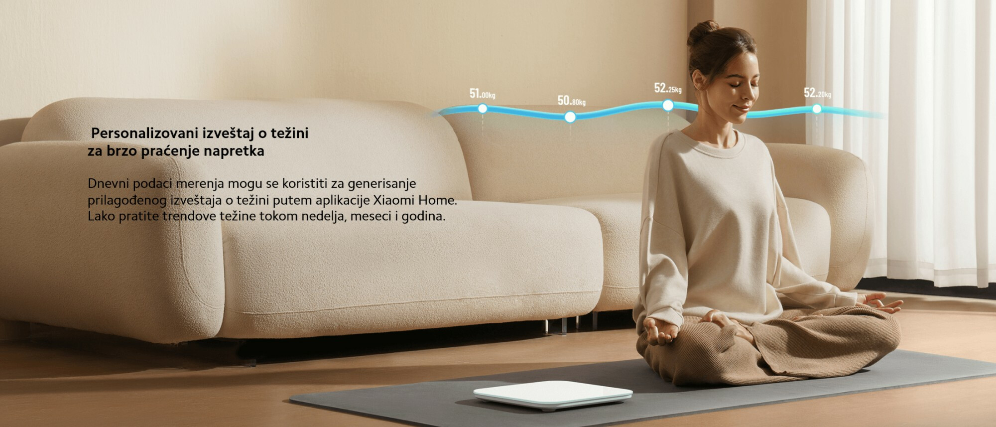 *Ispravan metod merenja: Molimo vas da nosite laganu odeću i merite u isto vreme i pod istim uslovima svaki dan. Za najtačnije podatke, merenja treba vršiti ujutru na prazan stomak. Ponašanja poput pijenja velikih količina vode, jedenja, intenzivne fizičke aktivnosti i tuširanja mogu uticati na rezultate merenja. Molimo vas da pratite uputstva proizvoda kako biste poboljšali pouzdanost merenja.