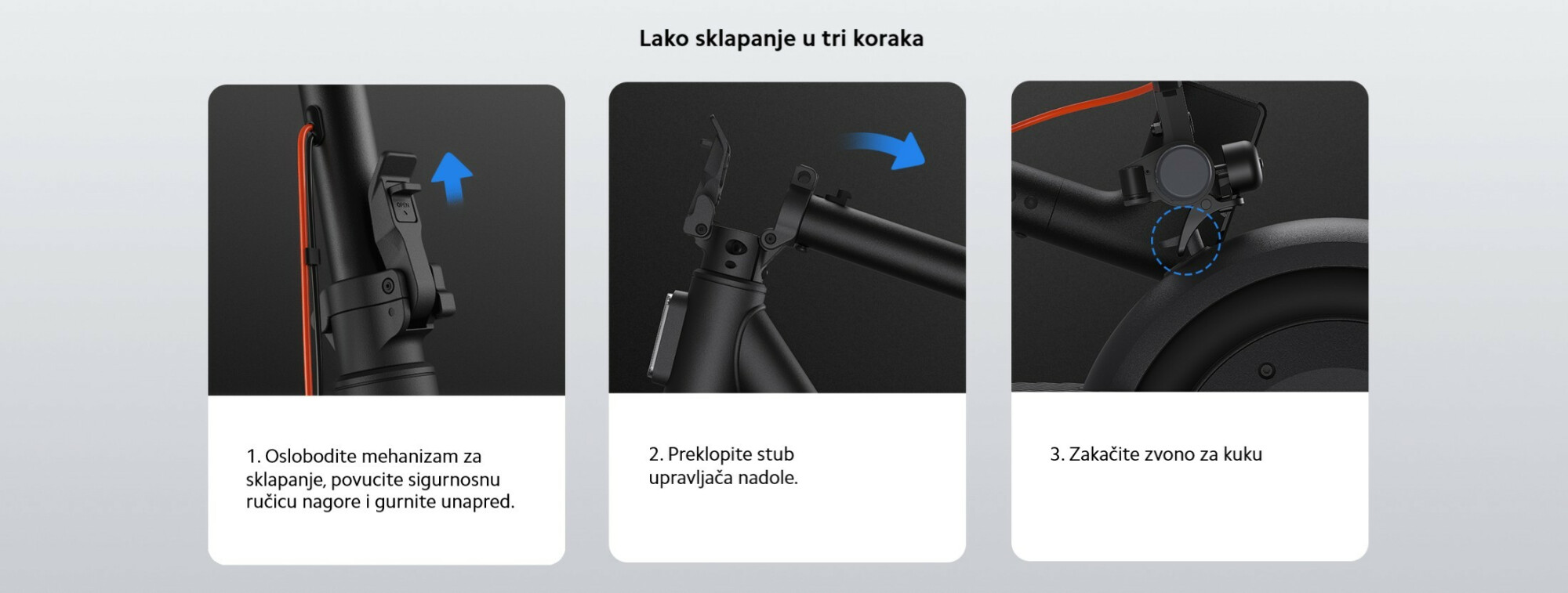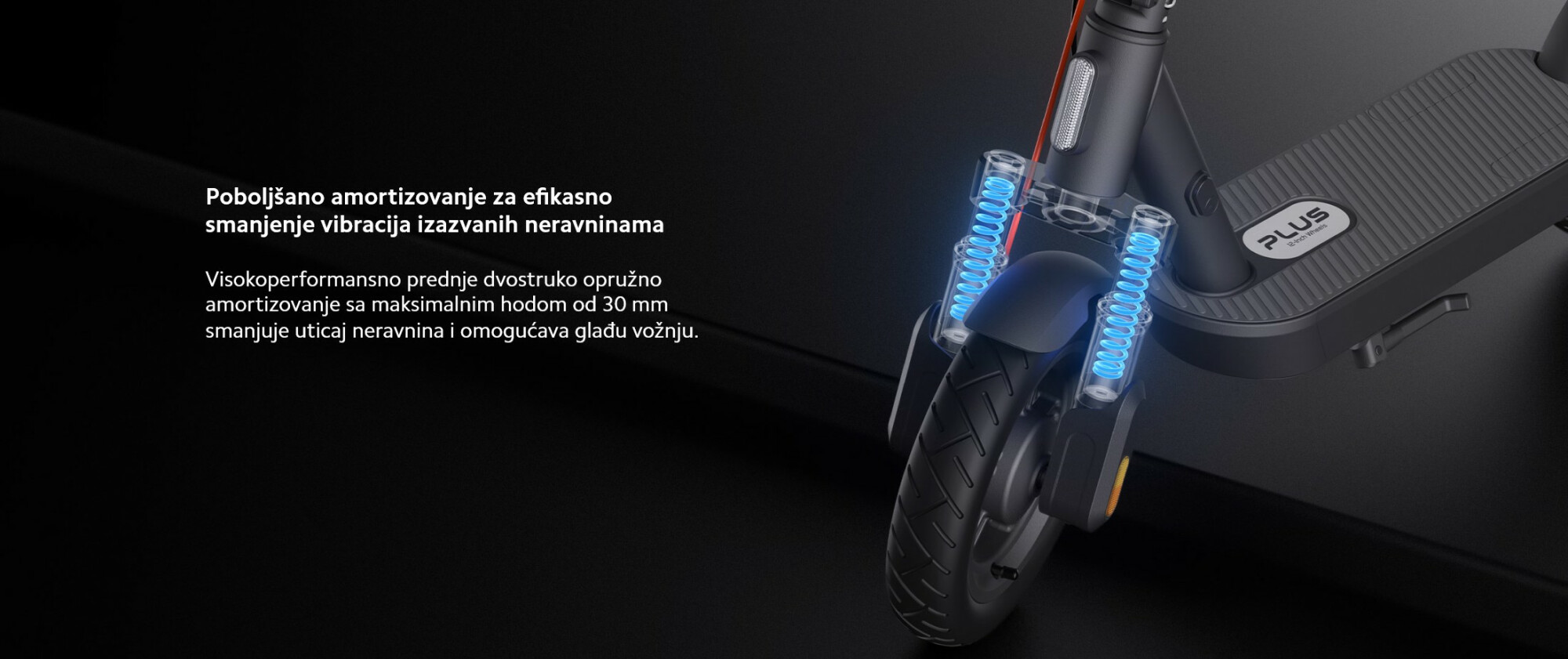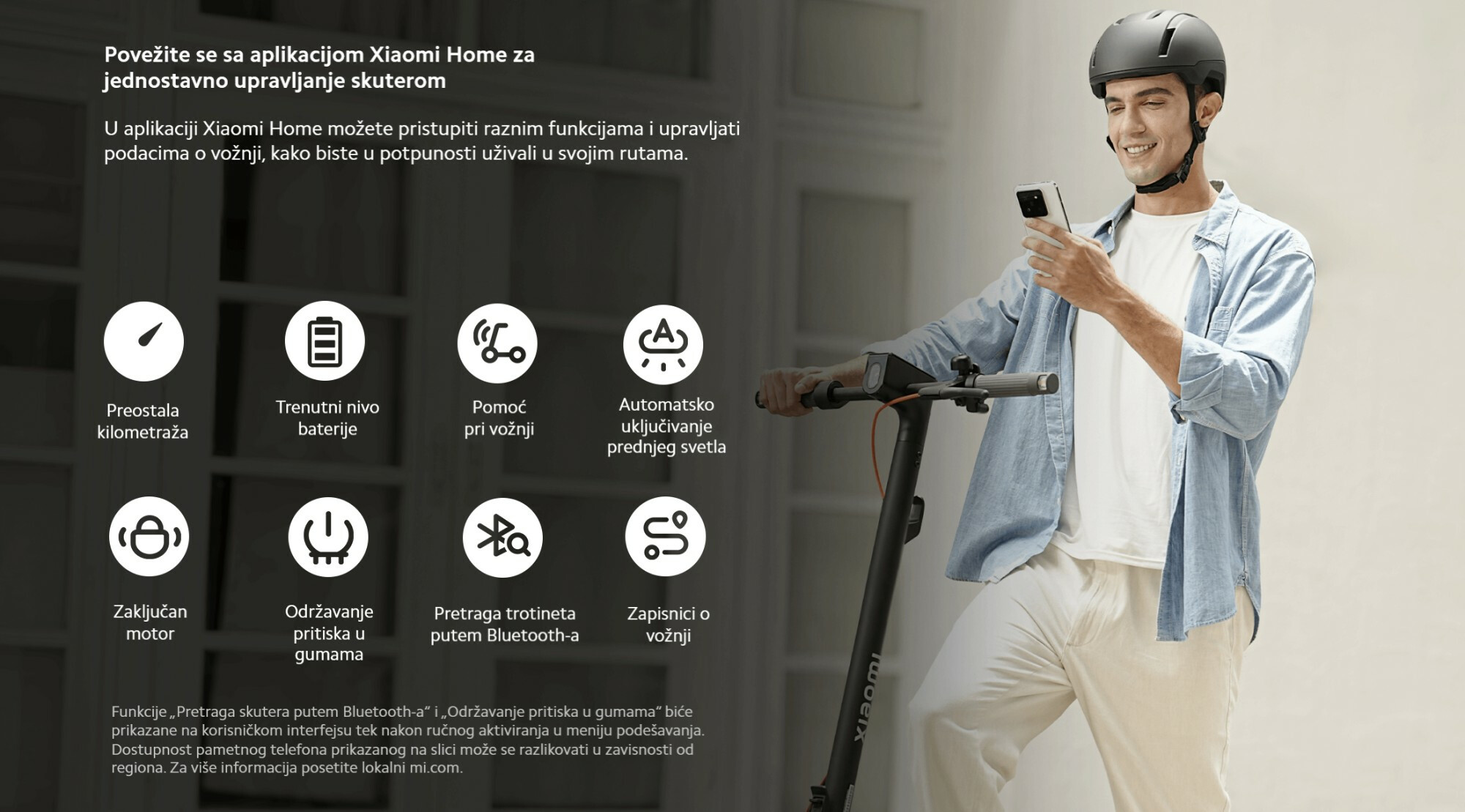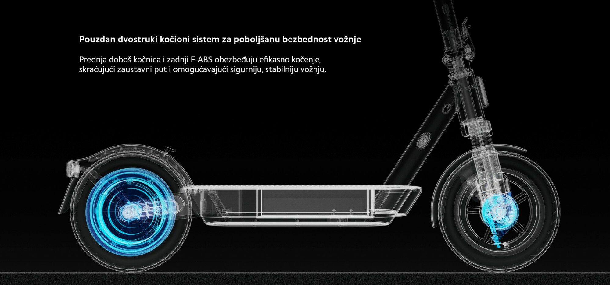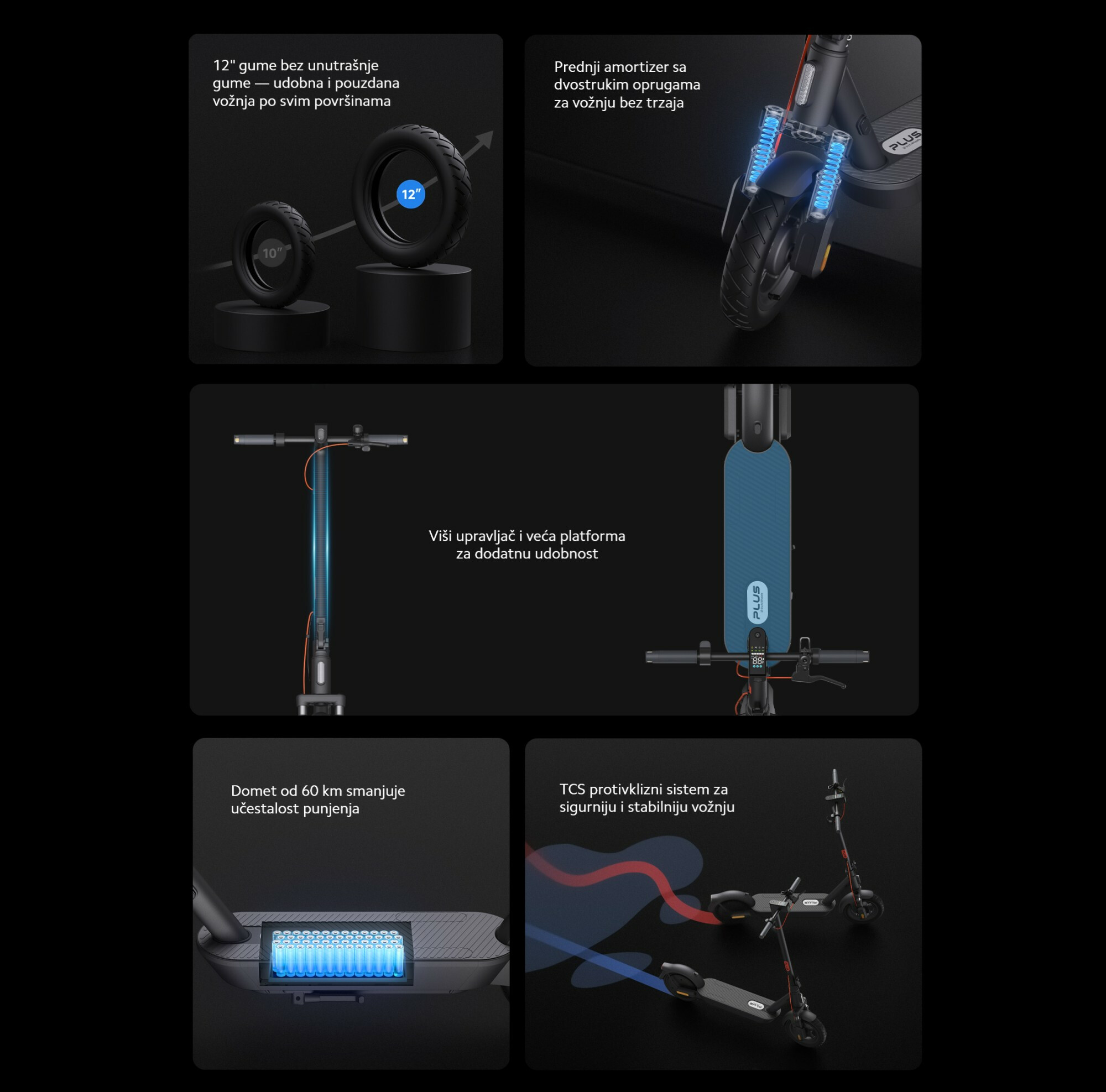 *Domet od 60 km: Testirano sa punom baterijom, opterećenjem od 75±5 kg, na ravnoj podlozi, pri konstantnoj brzini od 15 km/h, temperaturi od (25±5)°C i brzini vetra ≤3 m/s, sve dok vozilo više nije moglo da se koristi. Testirano od strane proizvođača. Stvarni rezultati mogu varirati u zavisnosti od uslova korišćenja.