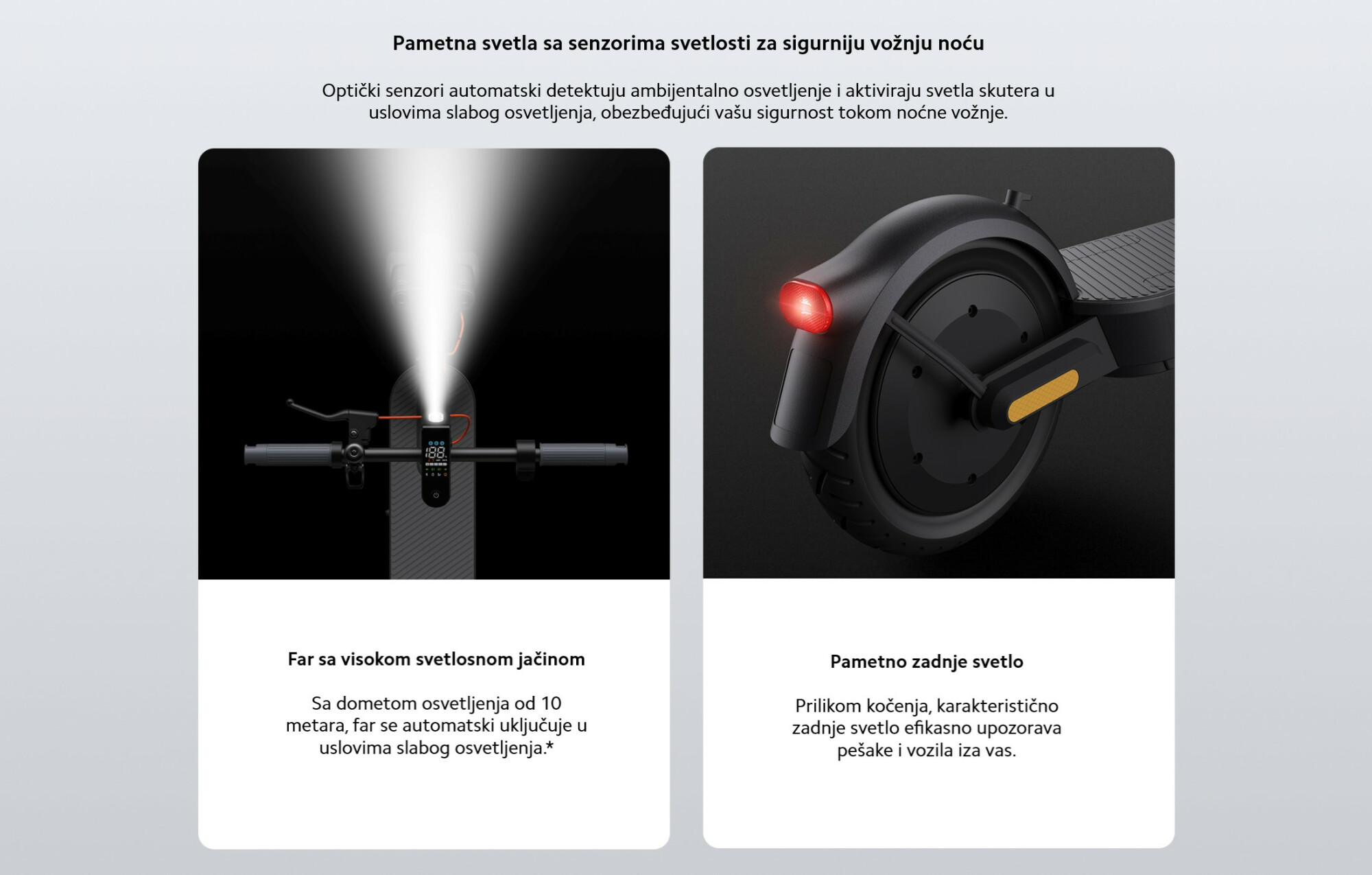 *Domet osvetljenja od 10 m: Skuter je vertikalno fiksiran, far uključen, a svetlosni snop izmeren metrom — domet je bio preko 10 m. Testirano od strane proizvođača.