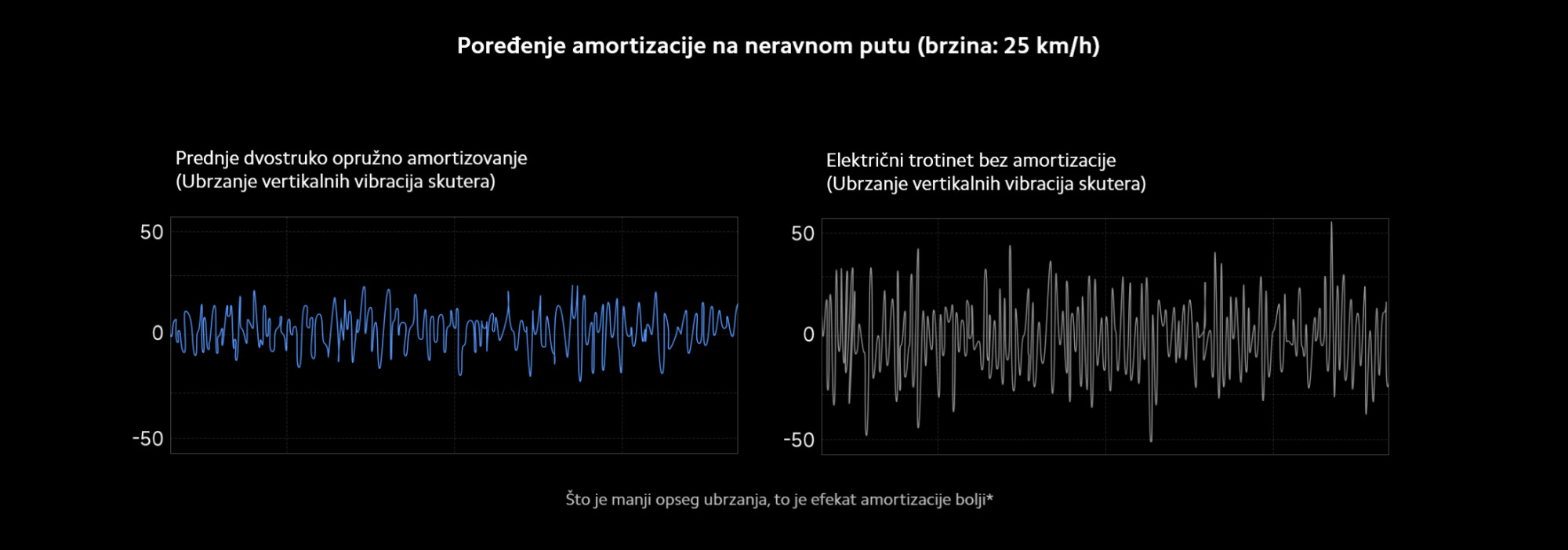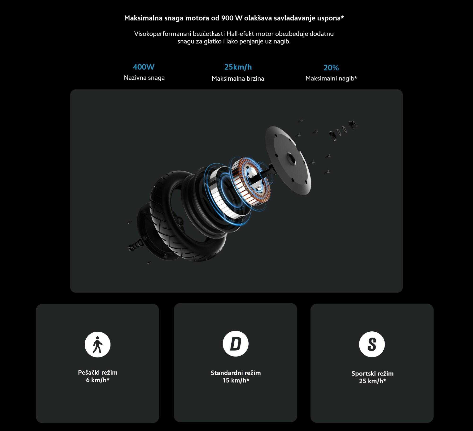 *Maksimalna brzina u Sport režimu: U ambijentu sa temperaturom od 25±5°C i brzinom vetra ≤3 m/s, skuter je dostigao 25 km/h. Brzina može varirati u zavisnosti od regiona i lokalnih propisa. Testirano od strane proizvođača.