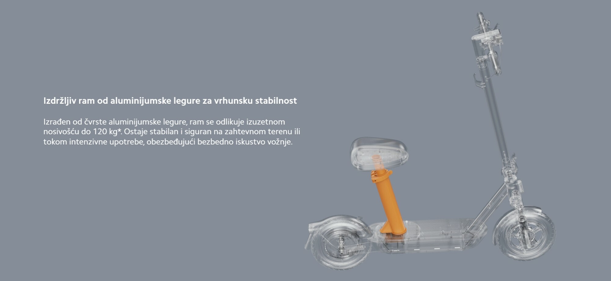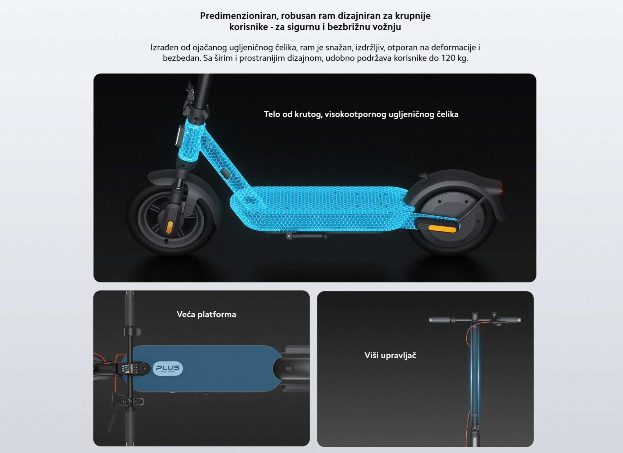 *Nosivost do 120 kg: Na nepomičan skuter postavljen je teret od 7000 N na površinu od 500 × 500 mm u centru platforme, tokom 5 minuta. Nakon testa, skuter je mogao normalno da se koristi bez savijanja, pucanja ili oštećenja. Testirano od strane proizvođača.