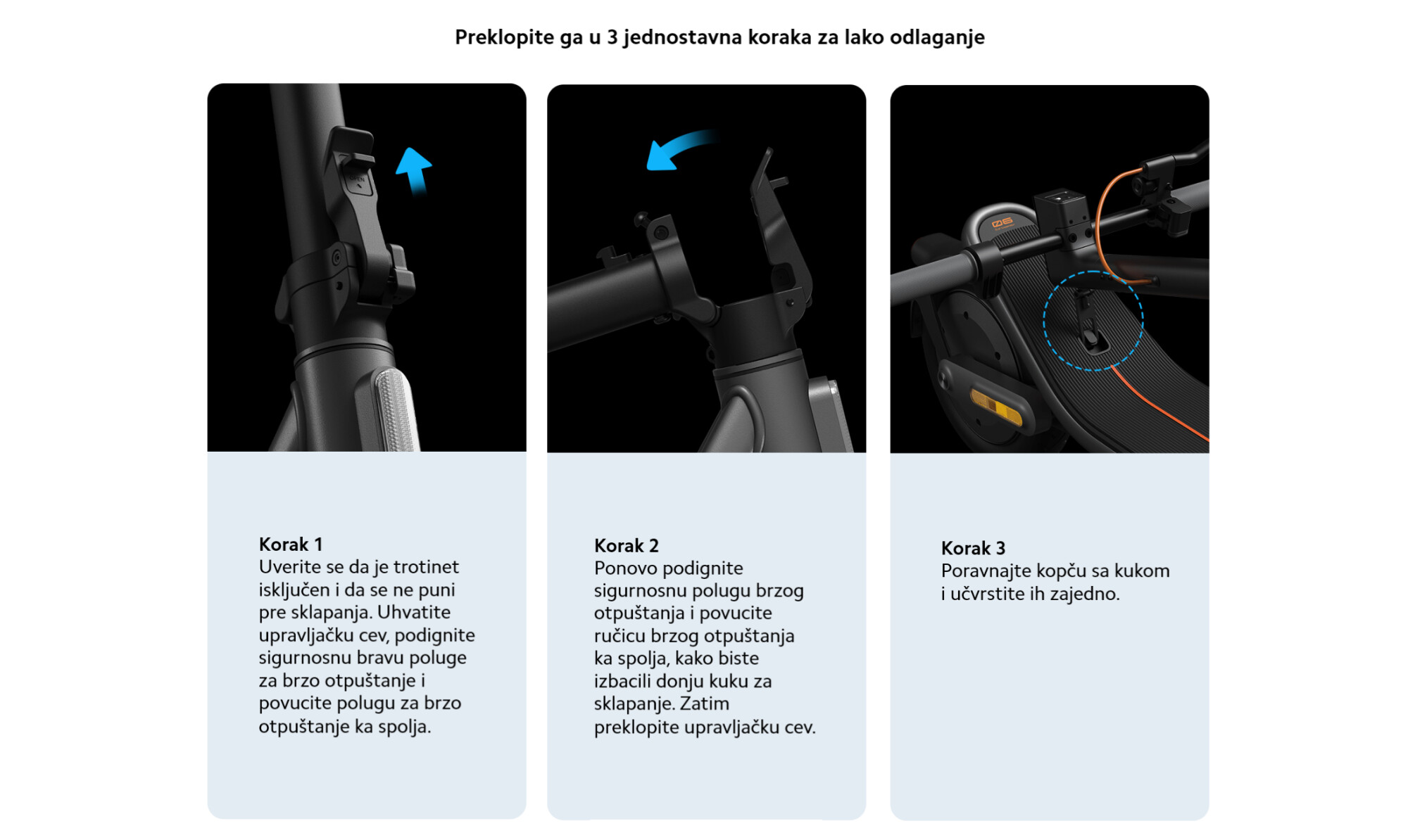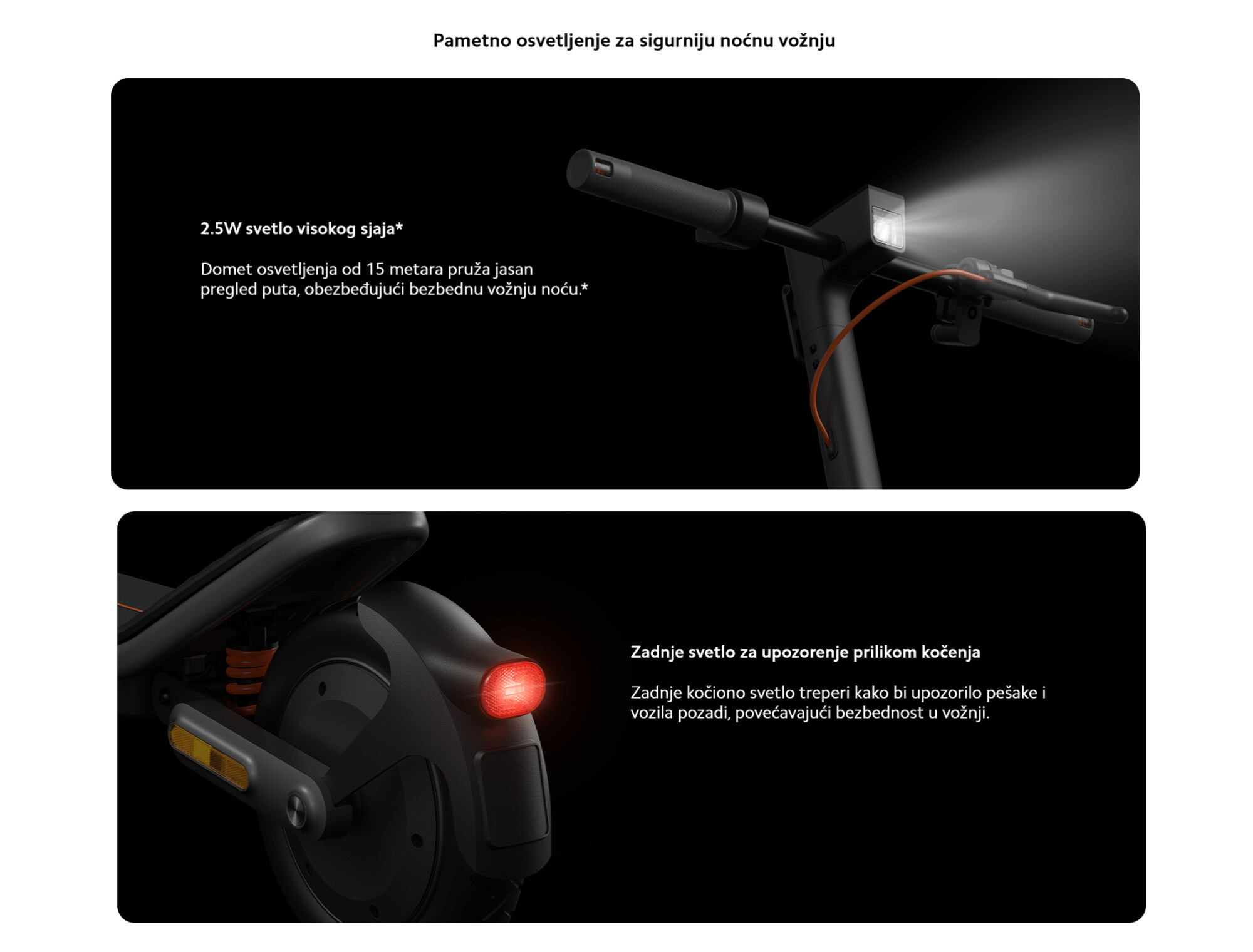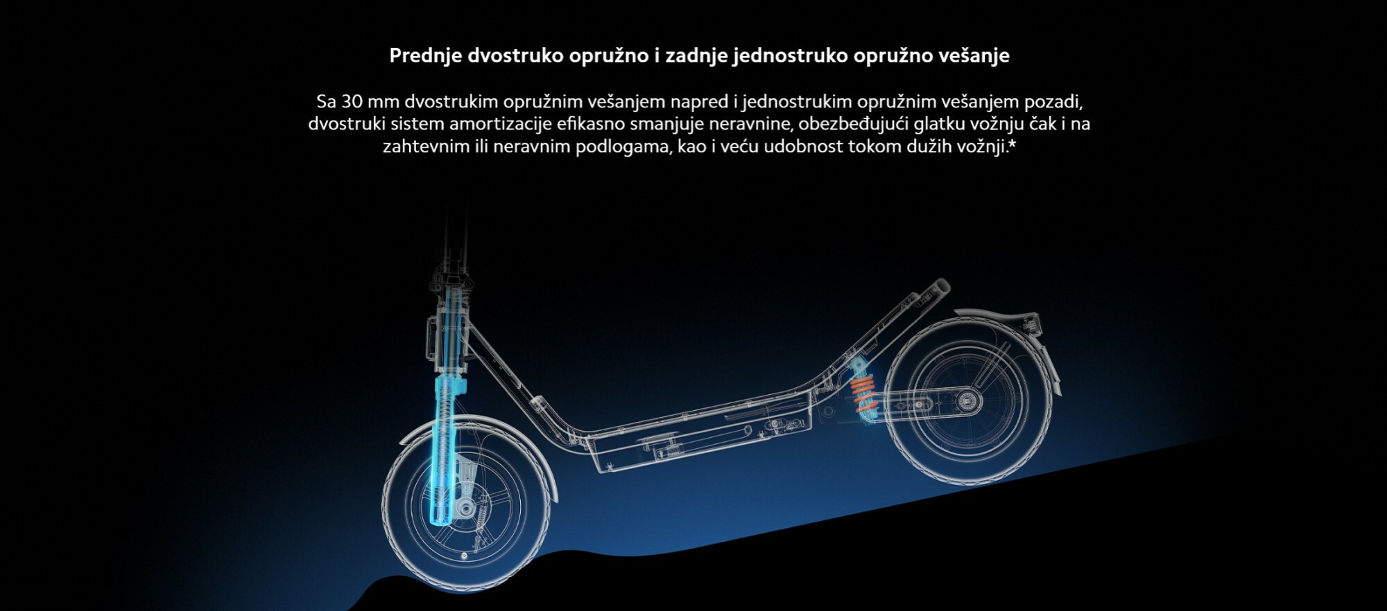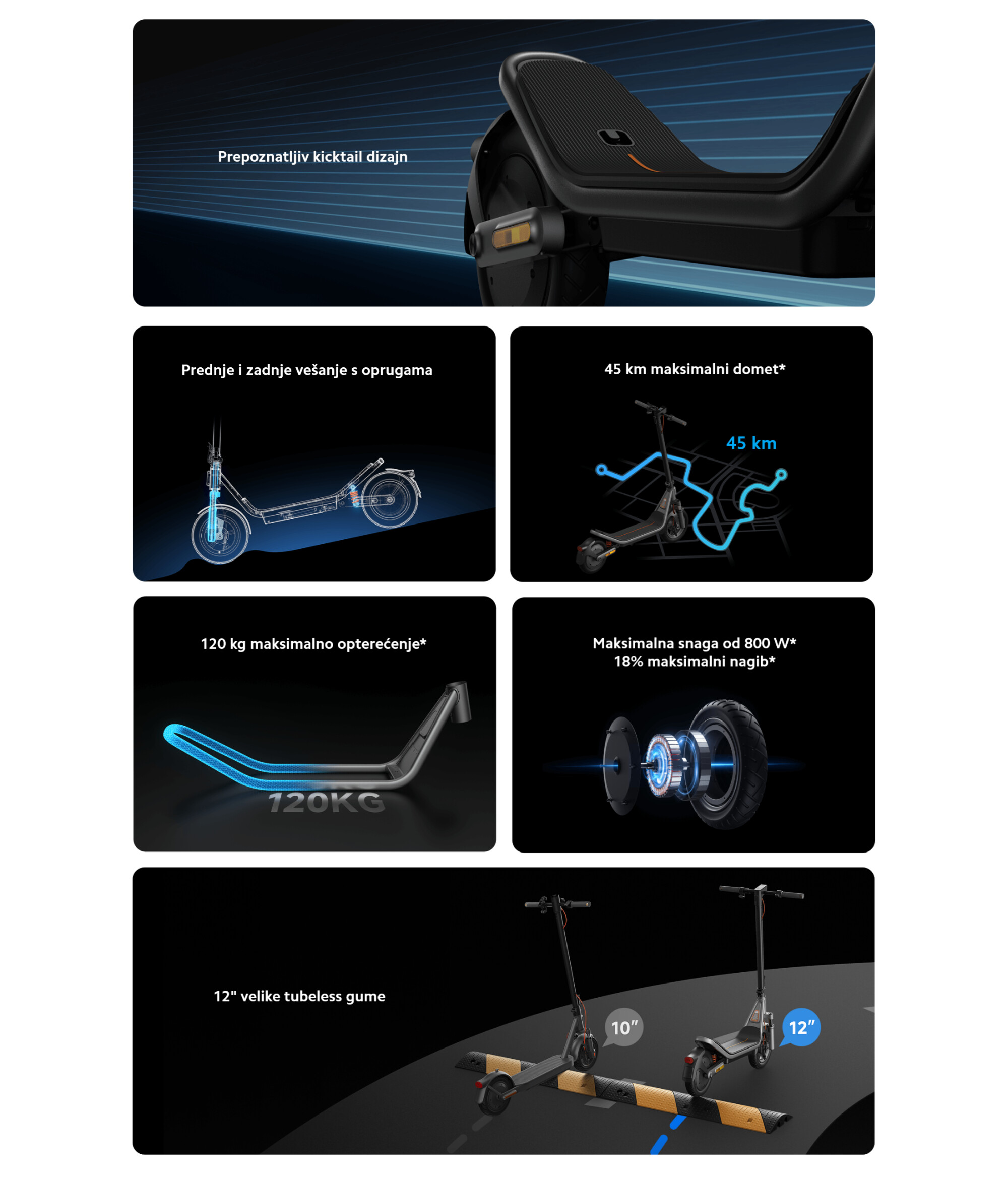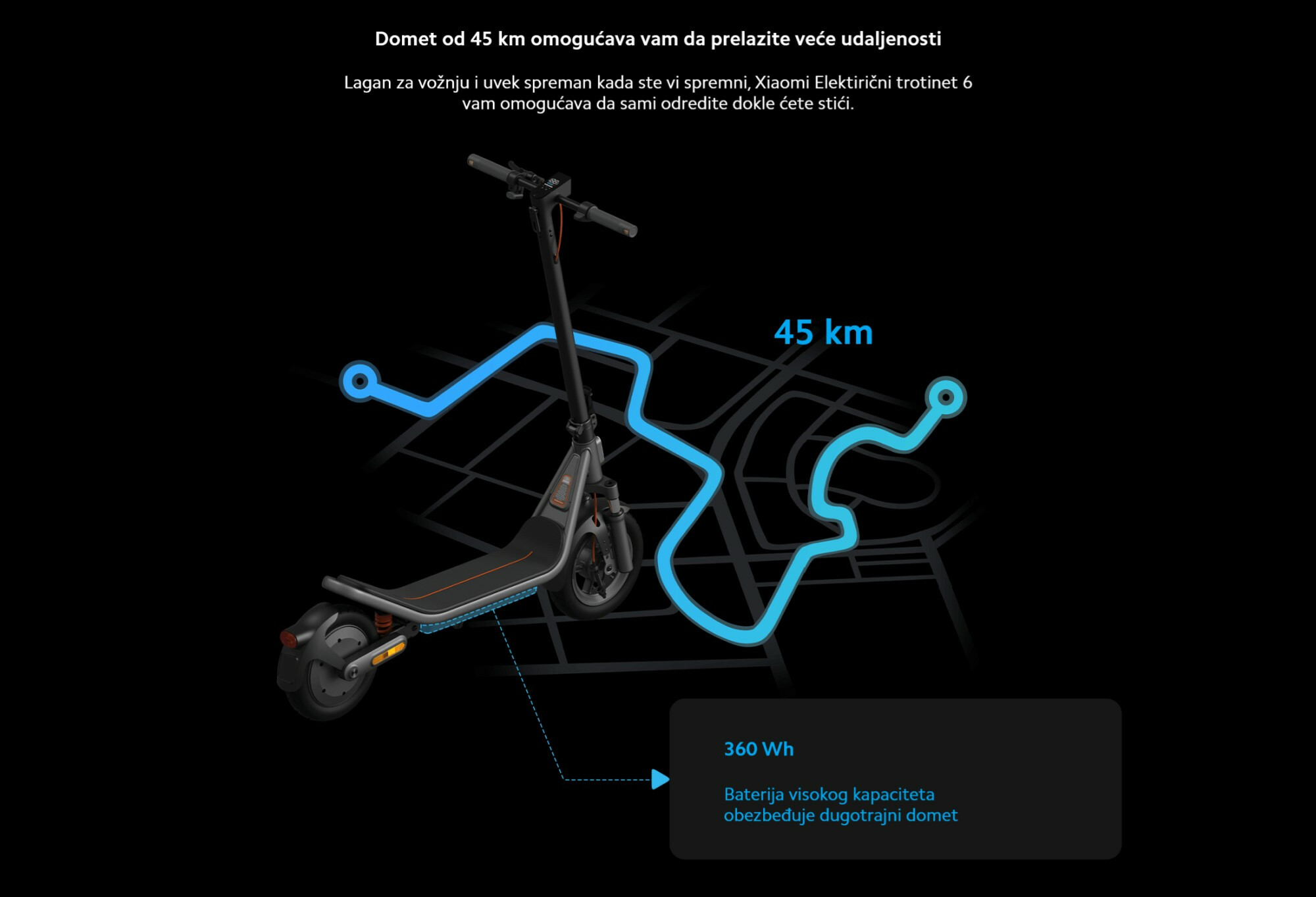 *Domet od 45 km: Test je sproveden korišćenjem potpuno napunjenog uzorka pri temperaturi okoline od 25±5 °C i maksimalnoj brzini vetra ≤3 m/s, na ravnoj asfaltnoj ili betonskoj zatvorenoj stazi s maksimalnim nagibom od 5 %, pri ukupnoj masi vozača i tereta od 75 kg, i konstantnoj brzini od 15 km/h. Kada baterija više nije u stanju da održi zadatu brzinu, trotinet nastavlja kretanje največom mogućom brzinom sve dok baterija ne prestane da omogućava rad.
