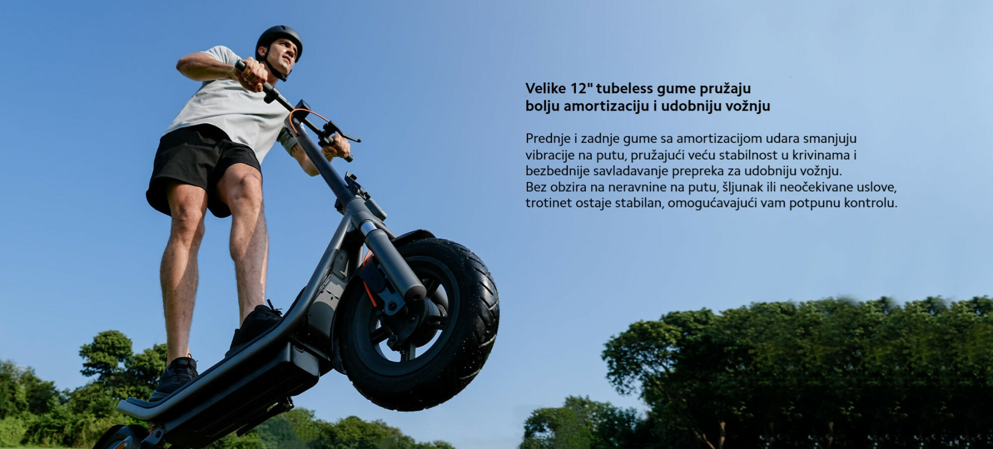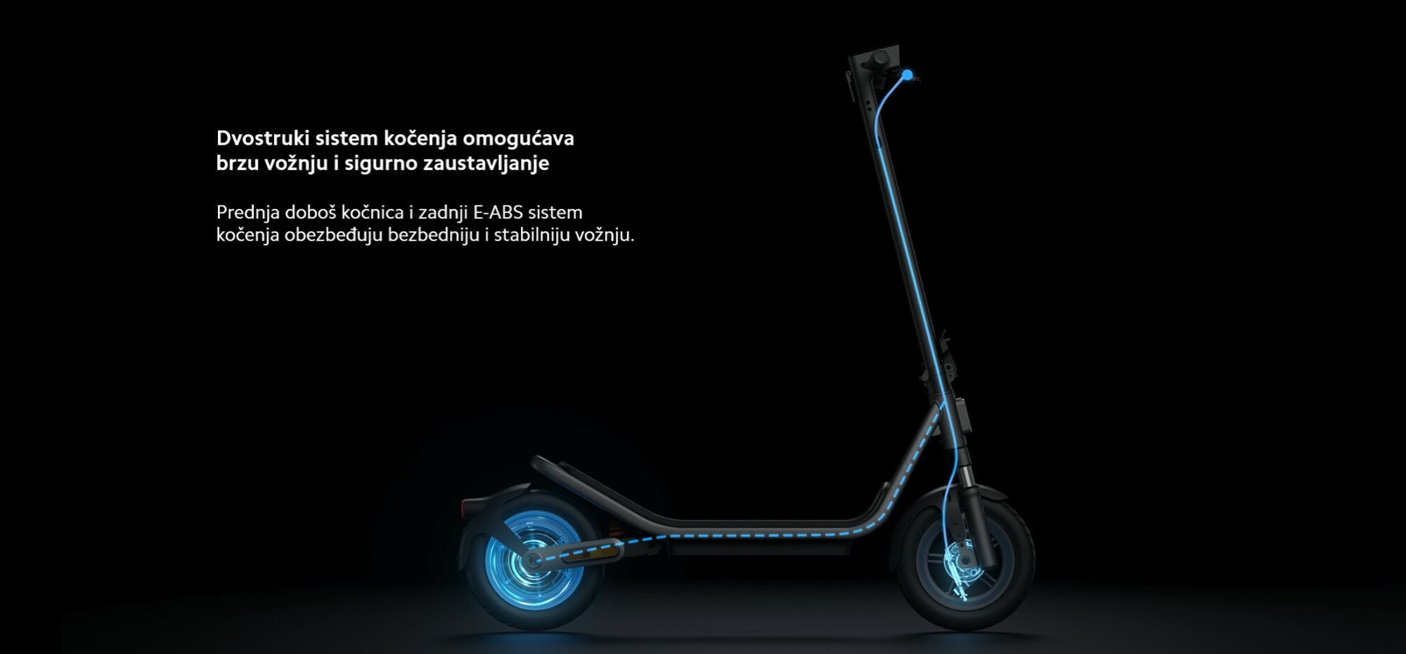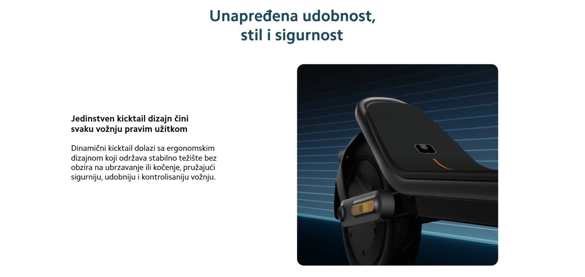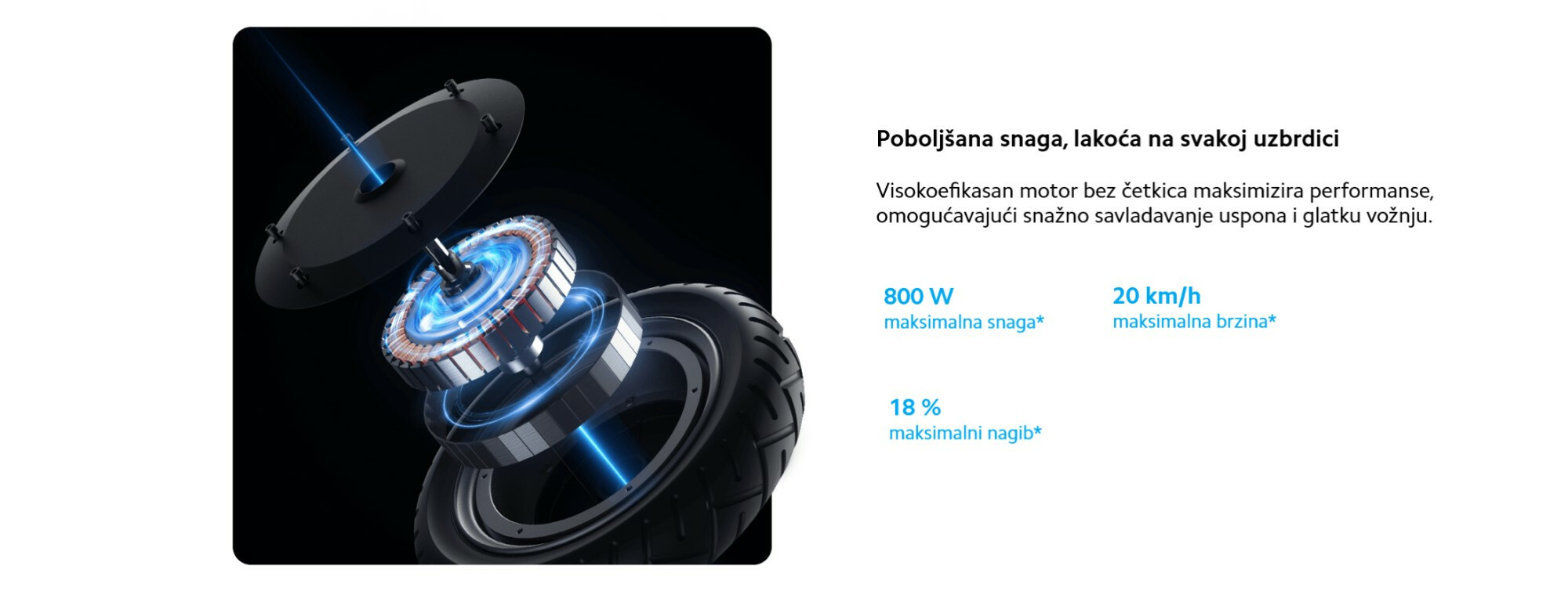 *Maksimalna brzina u Sportskom modu: Električni trotinet s potpuno napunjenom baterijom testiran je u Sportskom modu na sobnoj temperaturi (25±5 °C), uz prosečnu brzinu vetra ne veću od 3 m/s. Trotinet je ubrzan u pomoćnoj zoni vožnje, održavajući maksimalnu brzinu u testnoj zoni, i dostigao je 20 km/h, izmereno tahometrom, preko Bluetooth veze ili na kontrolnoj tabli. Maksimalna brzina može varirati u zavisnosti od zemlje ili regiona i podleže lokalnim propisima.