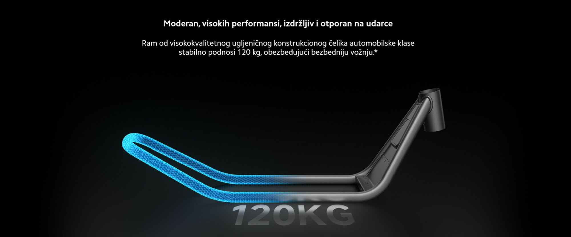 *Maksimalno opterećenje od 120 kg: Dok je trotinet bio u stanju mirovanja, na površinu od 500 × 500 mm u sredini platforme primenjeno je opterećenje od 7000 N tokom 5 minuta. Nakon testa, trotinet je ostao potpuno funkcionalan, bez savijanja, pucanja ili lomljenja.