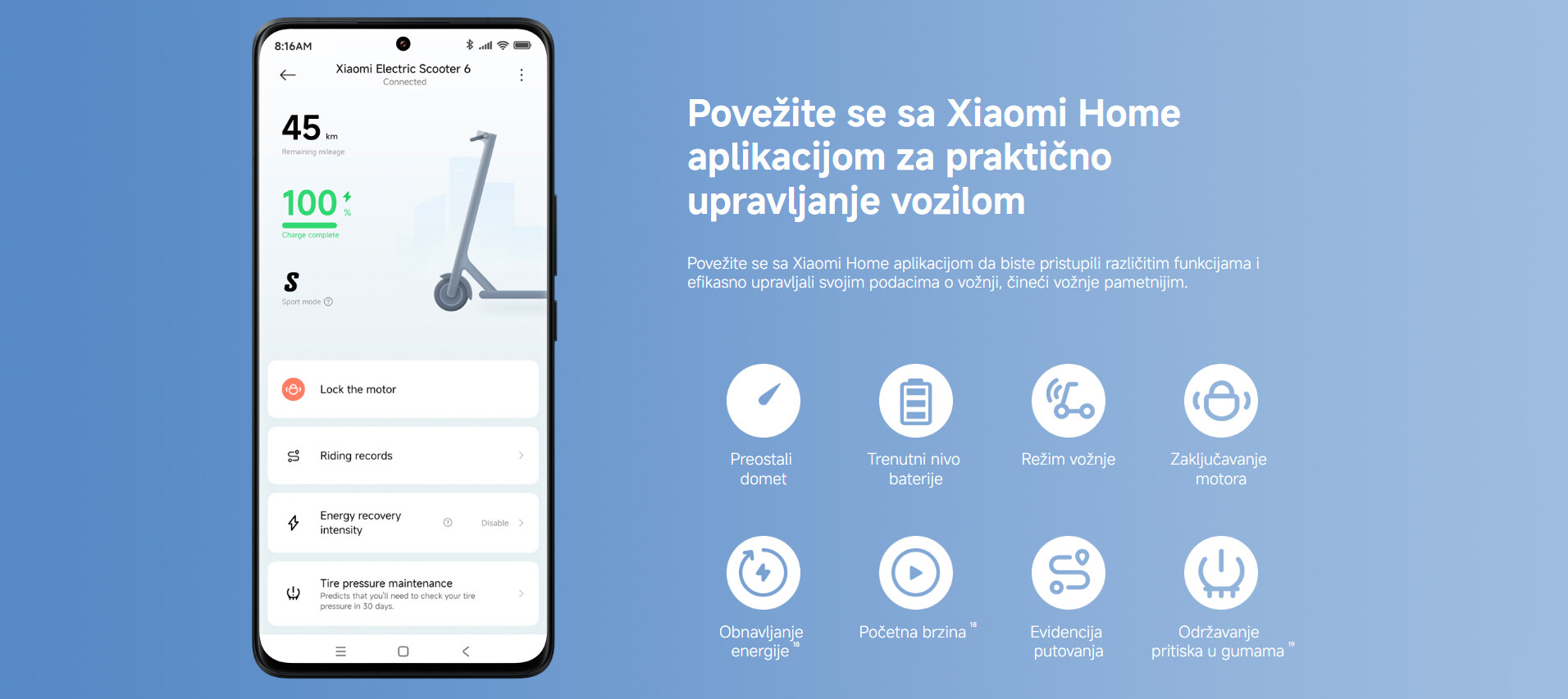 *Funkcije povrata energije i početne brzine biće dostupne u aplikaciji Xiaomi Home tek nakon što aktivirate opciju „Asistencija pri vožnji“.