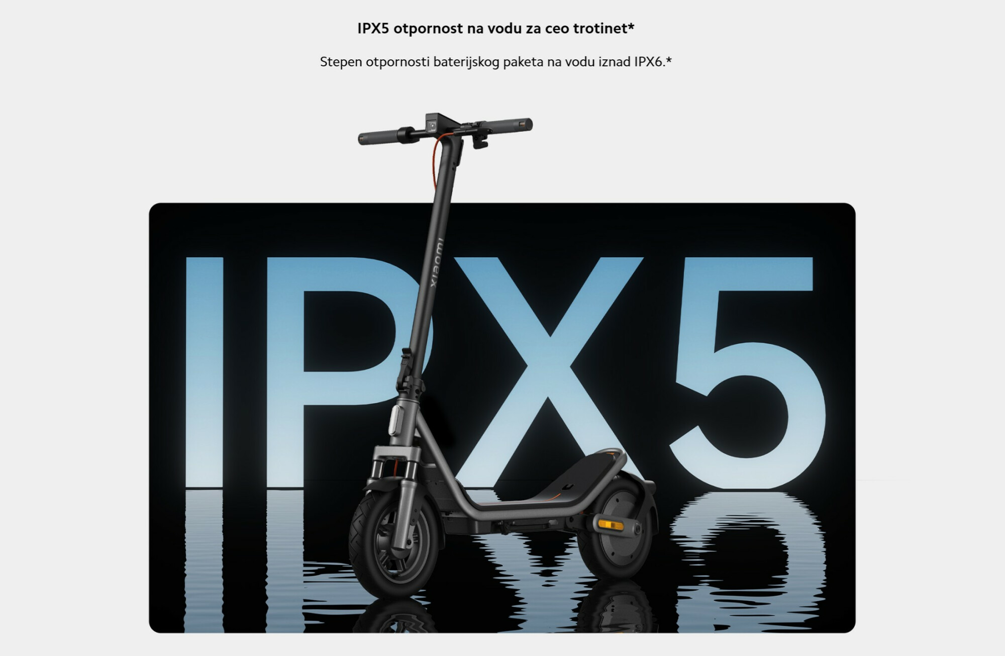 *IPX5 vodootporna zaštita: Korišćena je mlaznica prečnika 6,3 mm, s protokom vode od 12,5±0,625 L/min. Na udaljenosti od 2,5 m od mlaznice, prečnik glavnog mlaza vode bio je približno 40 mm. Test je trajao 3 minuta, s mlaznicom na udaljenosti od 2,5–3 m od trotineta. Nije bilo propuštanja vode.