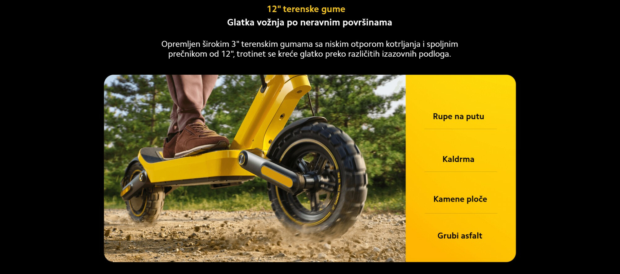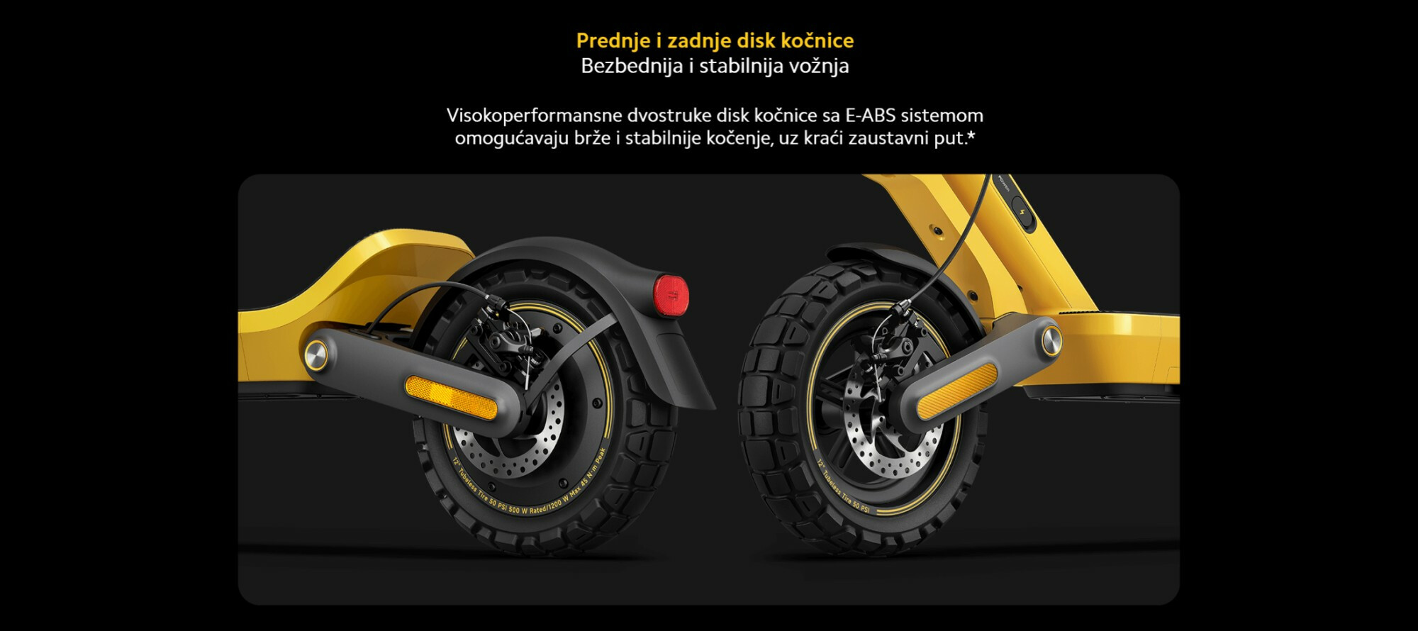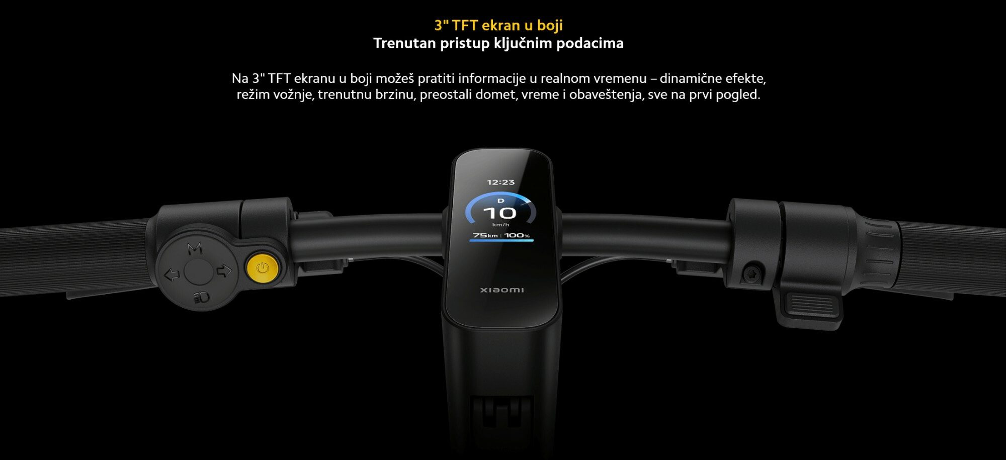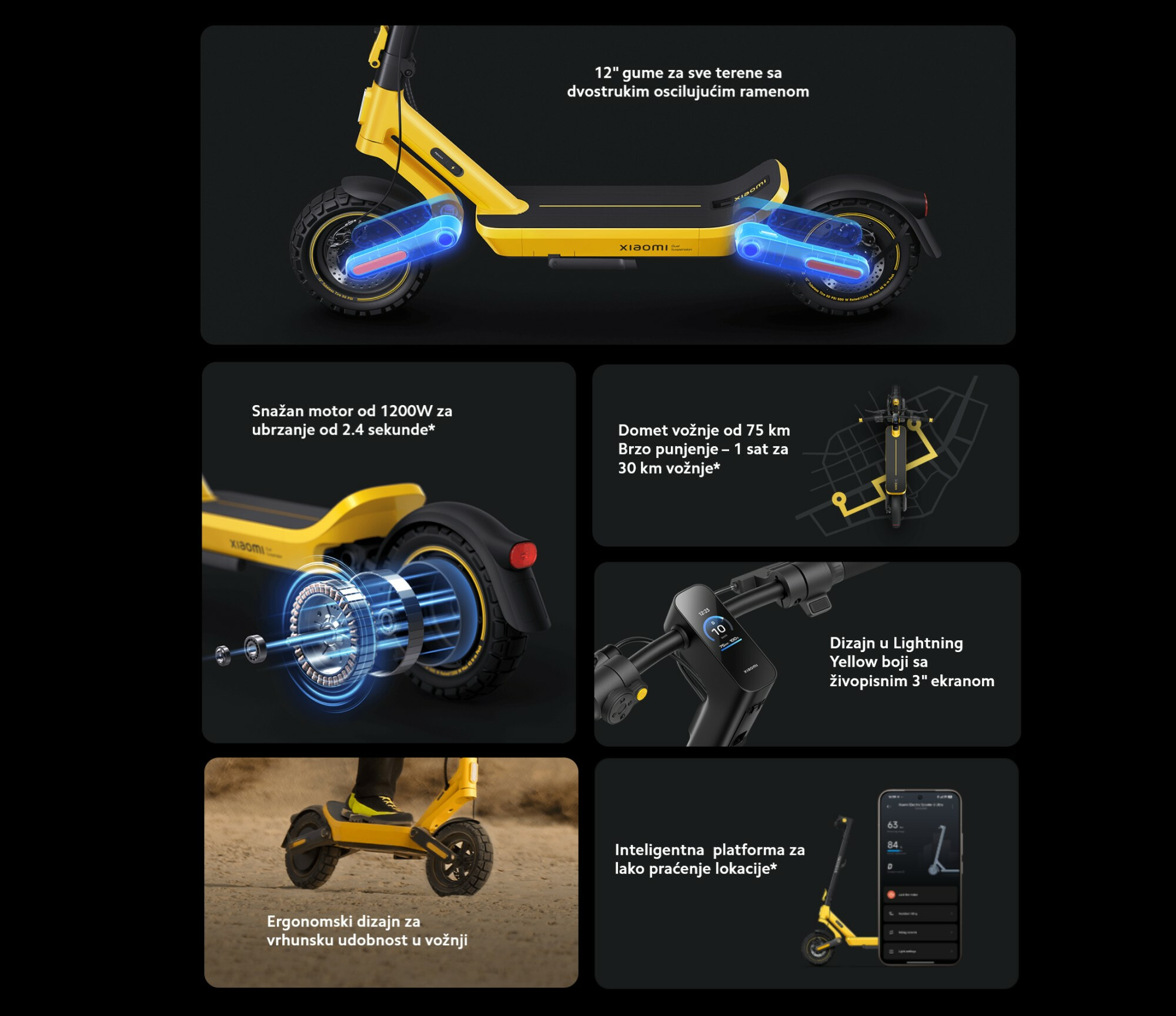 | Dodatne informacije | Povezivanje putem Xiaomi Home aplikacije; 12" terenske gume; Prednje i zadnje disk kočnice; Ergonomski dizajn; Terenska vožnja; TCS sistem protiv proklizavanja; Pametni sistem upravljanja baterijom |