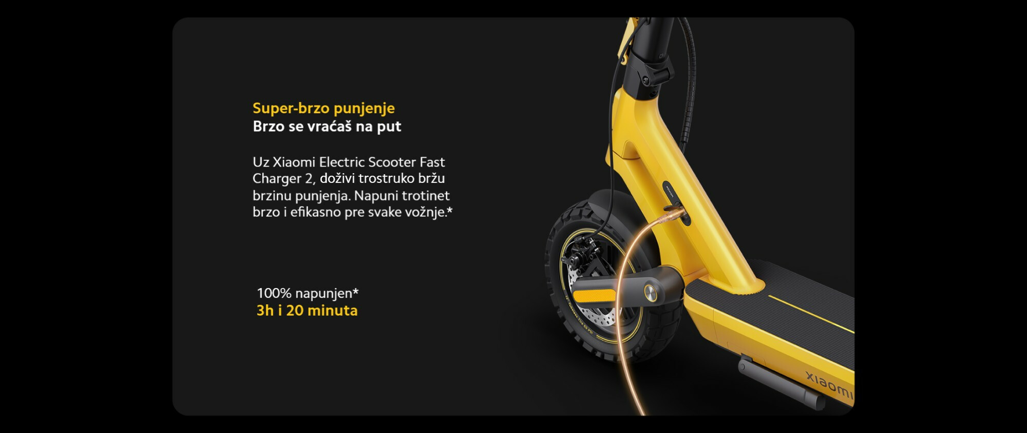 *Brzo punjenje za 3 sata i 20 minuta: U uslovima testiranja od 25 ± 2°C i 48% relativne vlažnosti, brzom punjaču je potrebno manje od 3 sata i 20 minuta da napuni Xiaomi električni trotinet 6 Ultra od 0% do 100%.