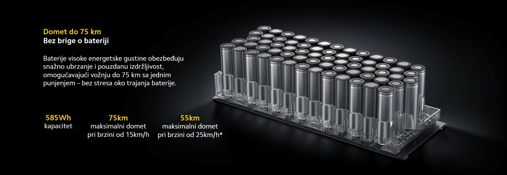 *Domet putovanja od 75 km: Testirano u uslovima bez vetra na temperaturi od 25 ± 2°C. Potpuno napunjen skuter je vožen konstantnom brzinom od 15 km/h na testnoj klupi do gašenja, sa teretom od 75 ± 0,5 kg. Testirao Beijing TIRT Technology Service Co., Ltd. Broj izveštaja: OTSA1-202501024.