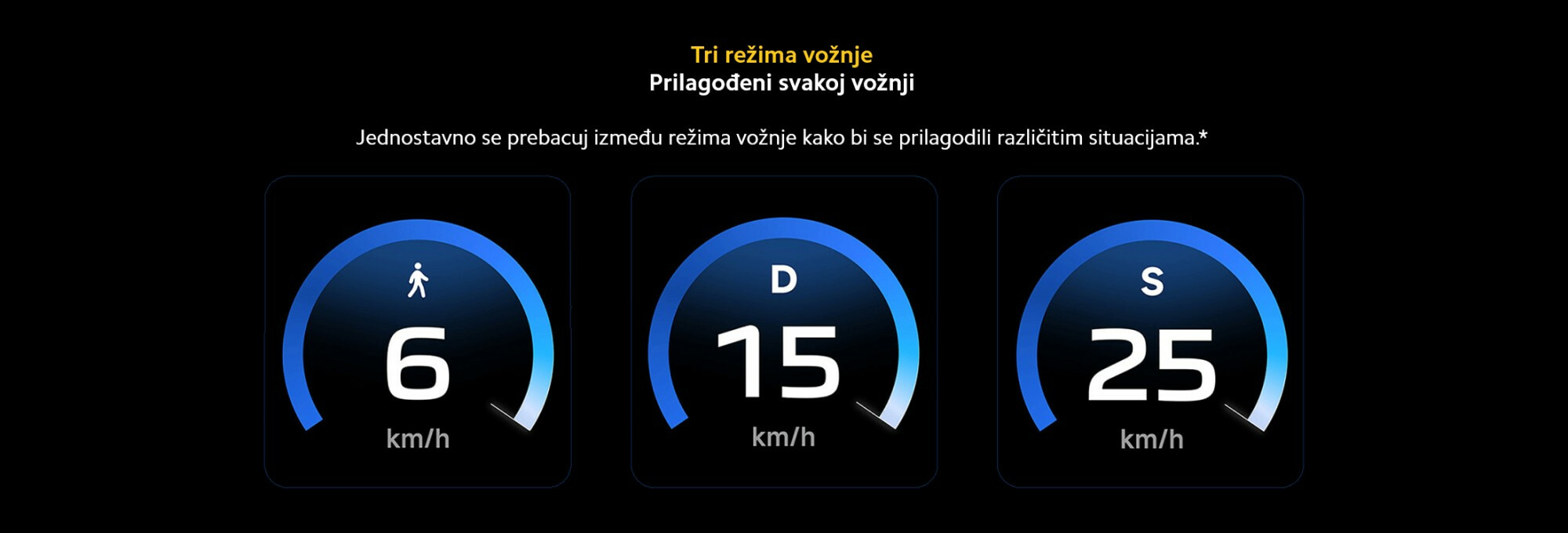 | Režim rada | Pešački režim 6km/h; Standardni režim 15km/h; Sportski režim 25km/h; Boost režim |