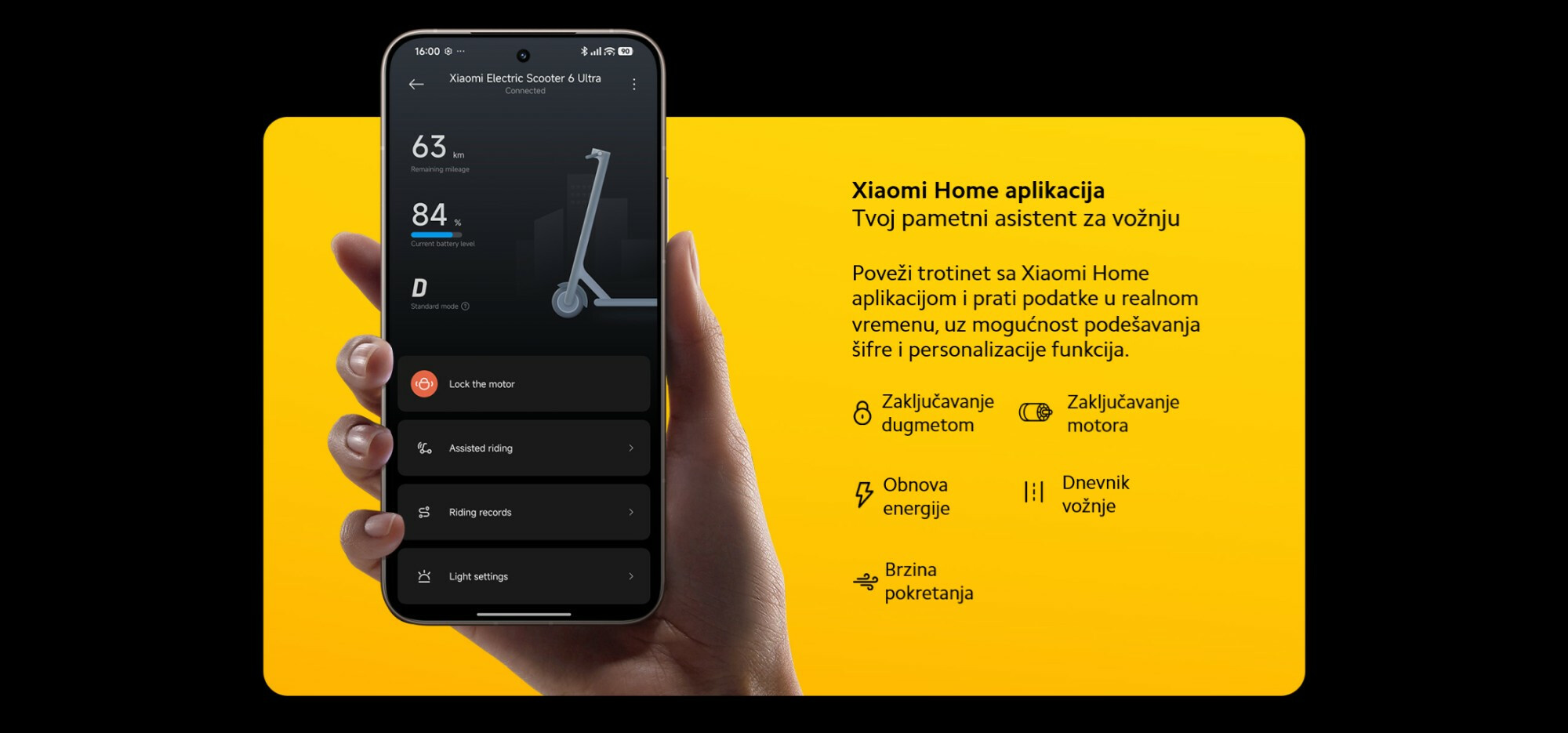 *Molimo vas da pažljivo pročitate uputstvo za upotrebu i pravnu izjavu za Xiaomi Electric Scooter 6 Ultra pre upotrebe i da se pridržavate lokalnih zakona i propisa tokom vožnje. *Sve slike, animacije, vizuelni prikazi interfejsa i drugi grafički sadržaj na ovoj stranici su samo u ilustrativne svrhe i mogu se razlikovati od stvarnog proizvoda.
