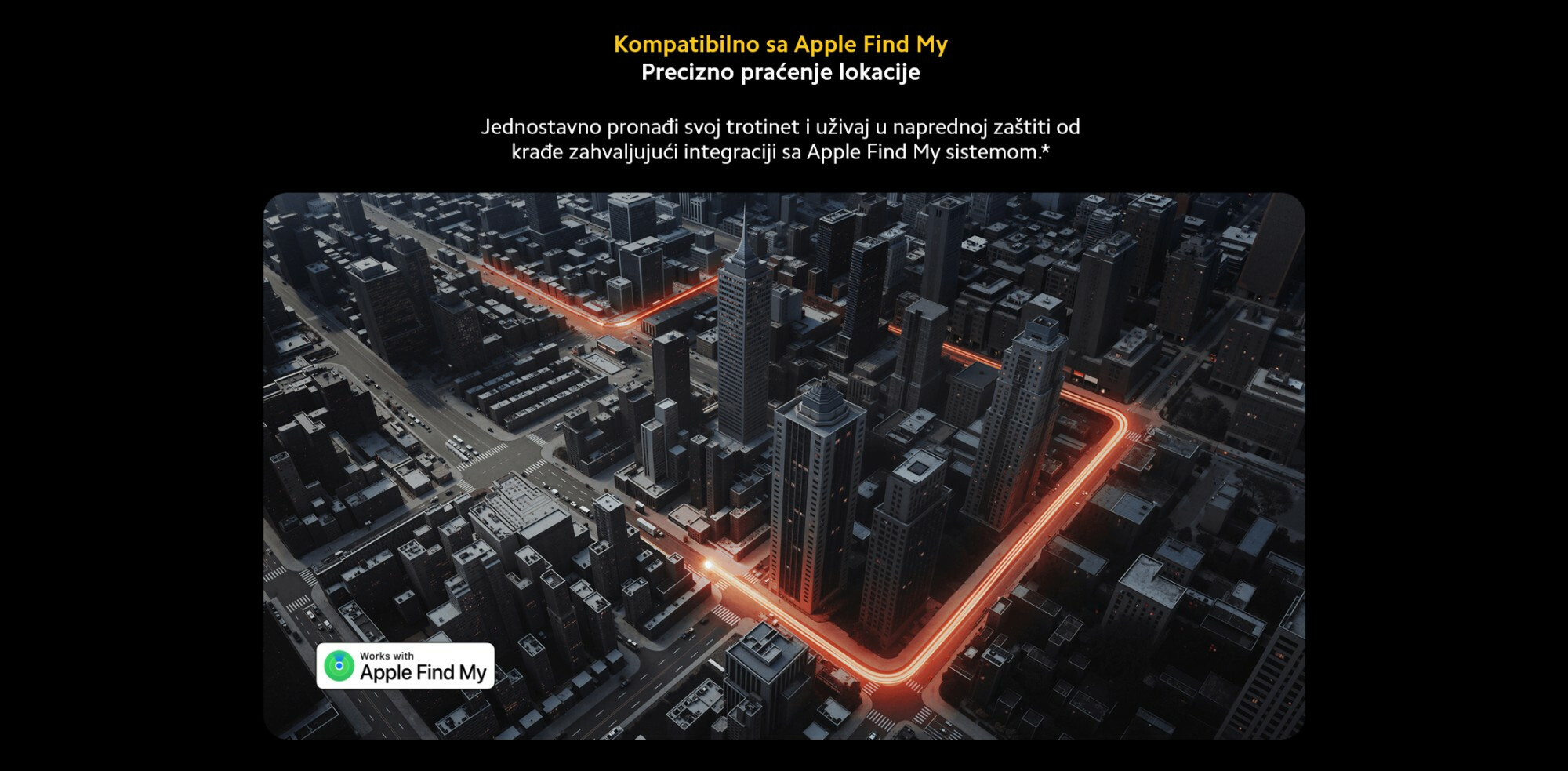 *Funkcija Apple Find My je podrazumevano onemogućena i potrebno je ručno omogućiti putem aplikacije Xiaomi Home ili aplikacije Find My. Potreban sistem: iOS 14.5 i macOS 11.5 ili noviji.