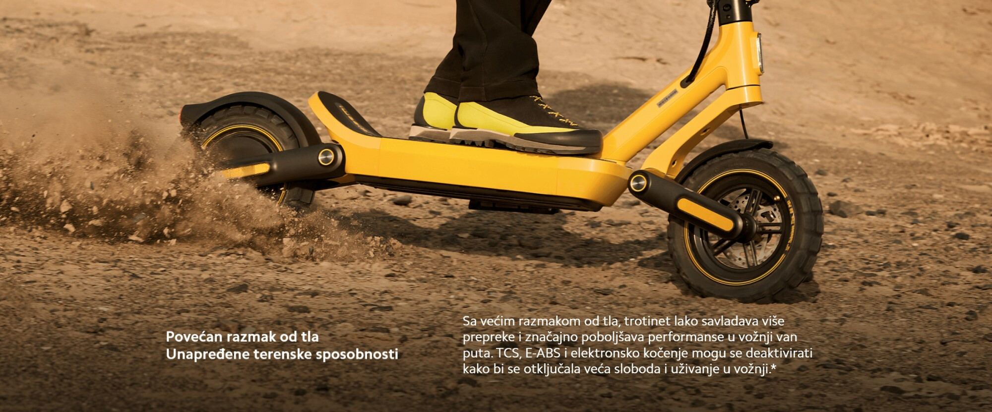 *Maksimalni nagib od 25%: Testirano na rampi od 10 m počevši od 15 km/h sa teretom od 75 kg i nivoom baterije od 70% ± 5%. Skuter je održavao pun gas u sportskom režimu i izlazio je sa rampe brzinom većom od 6 km/h.