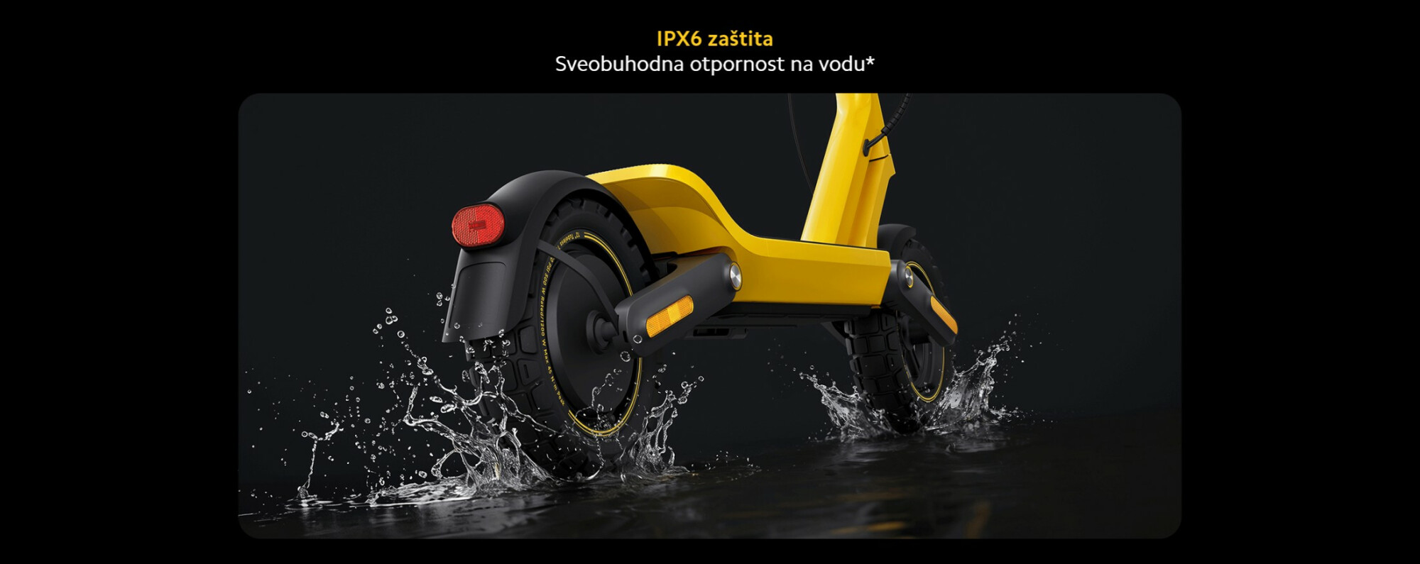 Iako trotinet ima IPX6 ukupnu vodootpornost, ipak se preporučuje izbegavanje vožnje po kiši ili kroz lokve kako bi se sprečio prodor vode. Dugotrajno izlaganje vodi može oštetiti unutrašnje elektronske komponente. Ako trotinet postane vlažan, temeljno ga osušite peškirom pre upotrebe.