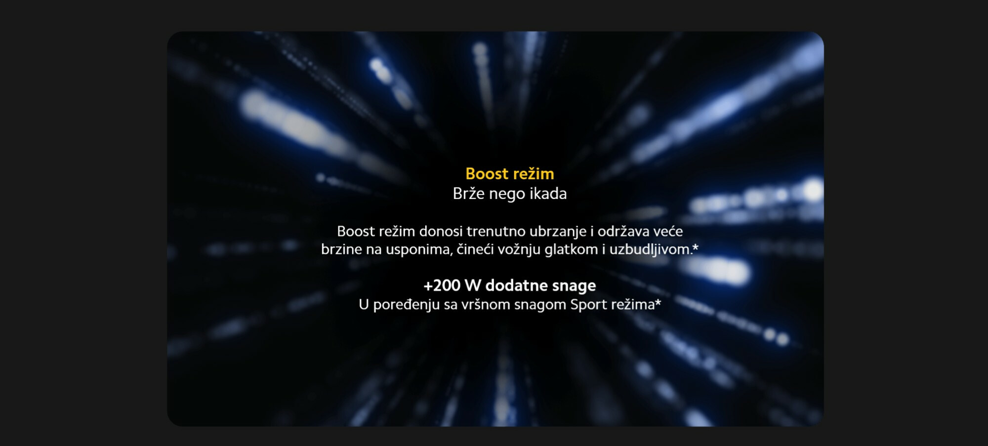 *Režim povećanja snage mora biti omogućen u aplikaciji i aktiviran pomoću dugmeta za napajanje skutera. Dostupan je samo u sportskom režimu kada je u stanju mirovanja, sa baterijom iznad 40% i normalnom radnom temperaturom.