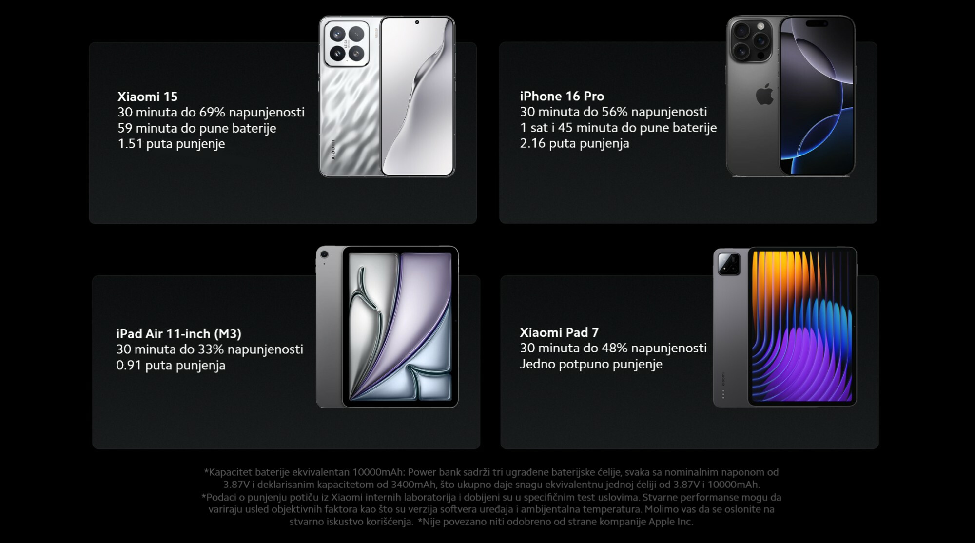 *Osim ako nije drugačije naznačeno, svi gore navedeni podaci potiču iz Xiaomi Internal Labs. Rezultati mogu da variraju u zavisnosti od objektivnih promena u okruženju, kao što su verzije softvera uređaja i temperatura okoline.