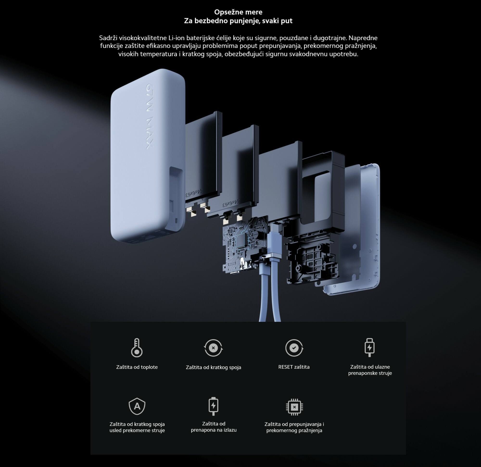 *Prilikom istovremenog punjenja dva ili više uređaja, ukupna teoretska izlazna snaga na svim portovima je 15W. Ako kombinovana potražnja za snagom prelazi ukupni izlazni kapacitet prenosne baterije, neki uređaji se možda neće puniti. Stvarne performanse mogu varirati u zavisnosti od uslova. Ova prenosna baterija uključuje jedan integrisani USB-C kabl; ostali kablovi za punjenje moraju se kupiti zasebno.