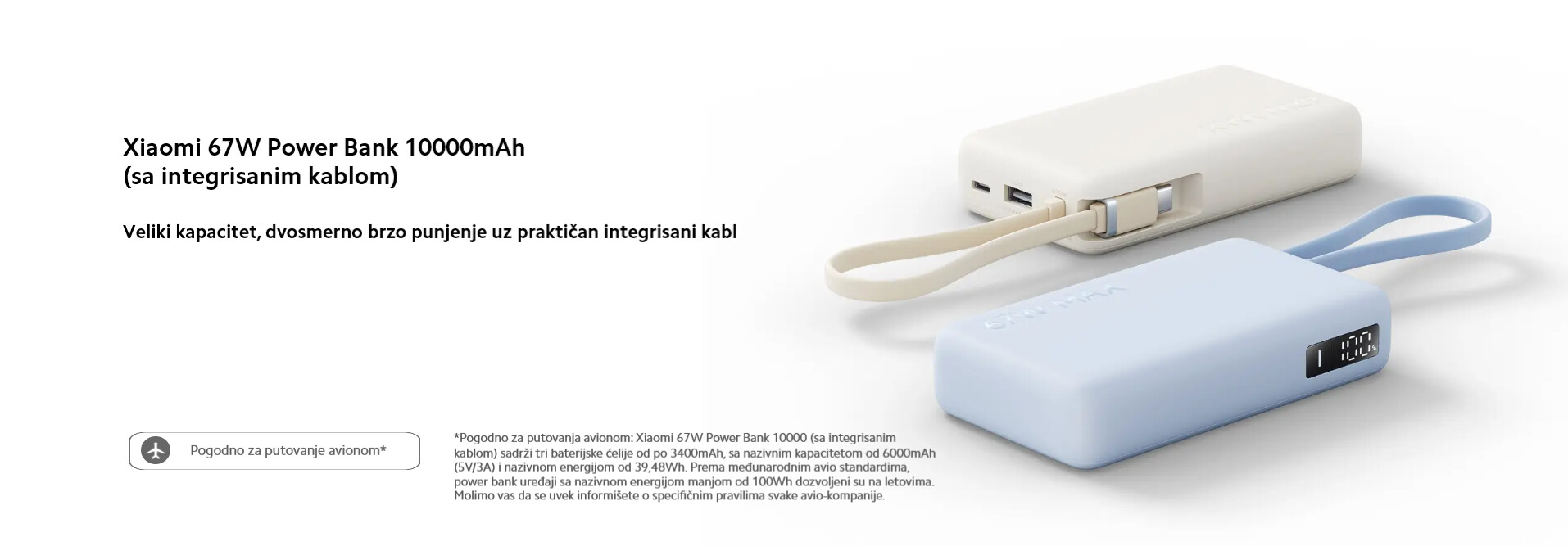 *Pogodno za putovanje avionom: Xiaomi 67W Power Bank 10000 (integrisani kabl) sadrži tri baterijske ćelije od 3400mAh, sa nominalnim kapacitetom od 6000mAh (5V/3A) i nominalnom energijom od 39,48Wh. Prema Međunarodnom standardu za avijaciju, prenosne baterije sa nominalnom energijom ispod 100Wh su dozvoljene na letovima. Molimo pogledajte specifične propise svake avio-kompanije.