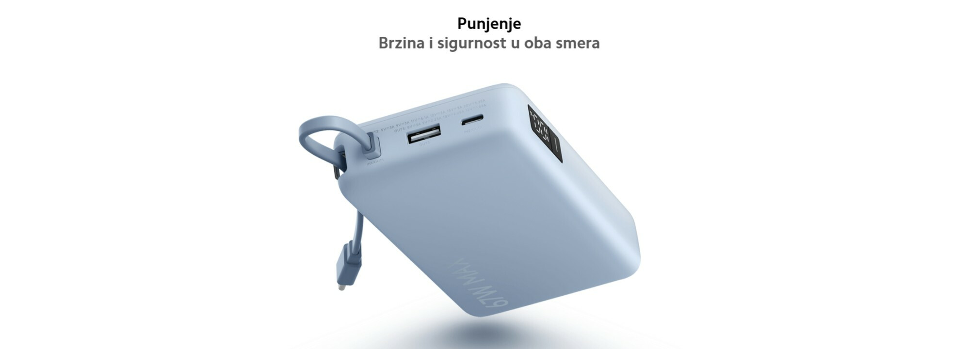| Priključci | Ulazni: USB-C/USB-C integrisani kabl; Izlazni: USB-C integrisani kabl/USB-C/USB-A |