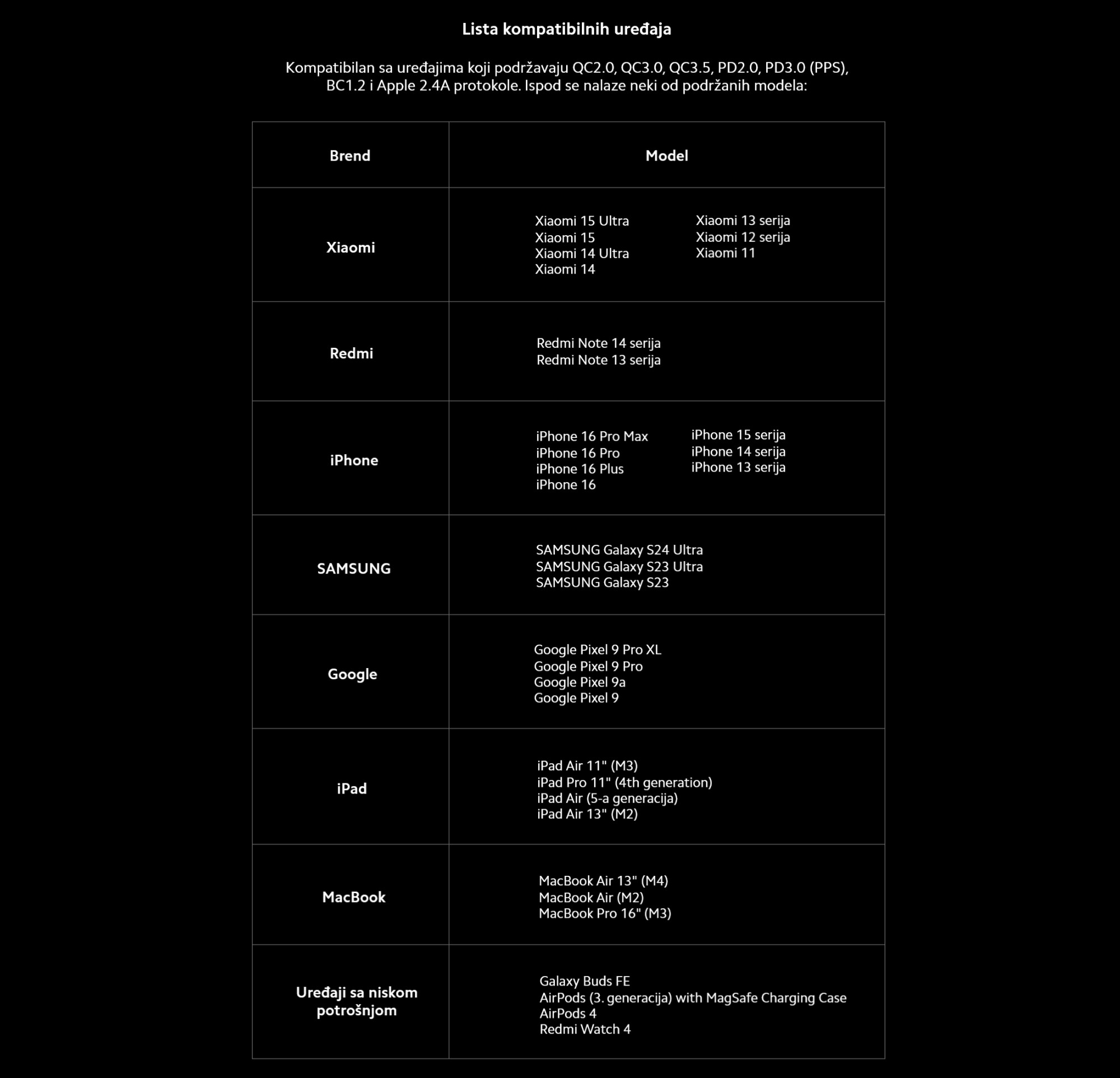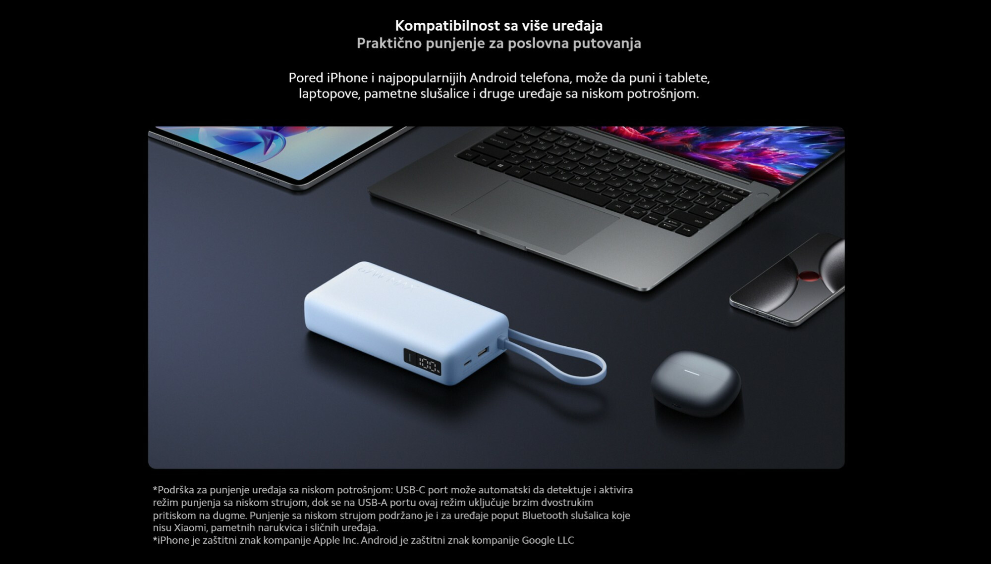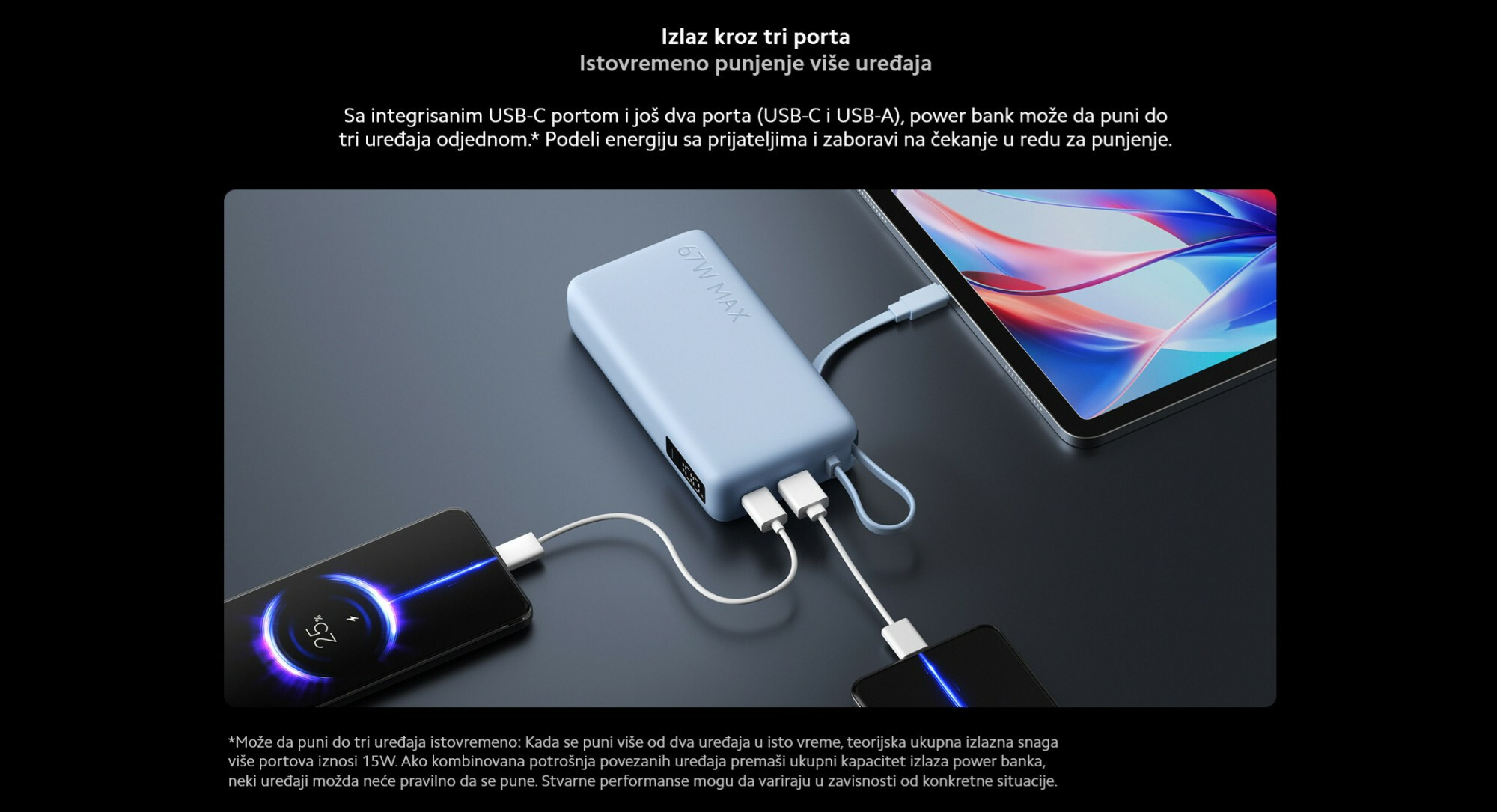*Preporučuje se korišćenje adaptera sa kompatibilnim specifikacijama prilikom istovremenog punjenja i pražnjenja. Stvarne performanse punjenja mogu varirati u zavisnosti od korišćenog adaptera. *Zbog ambijentalnog osvetljenja, izgled proizvoda može pokazivati male razlike u boji. Stvarni izgled će biti prednost.