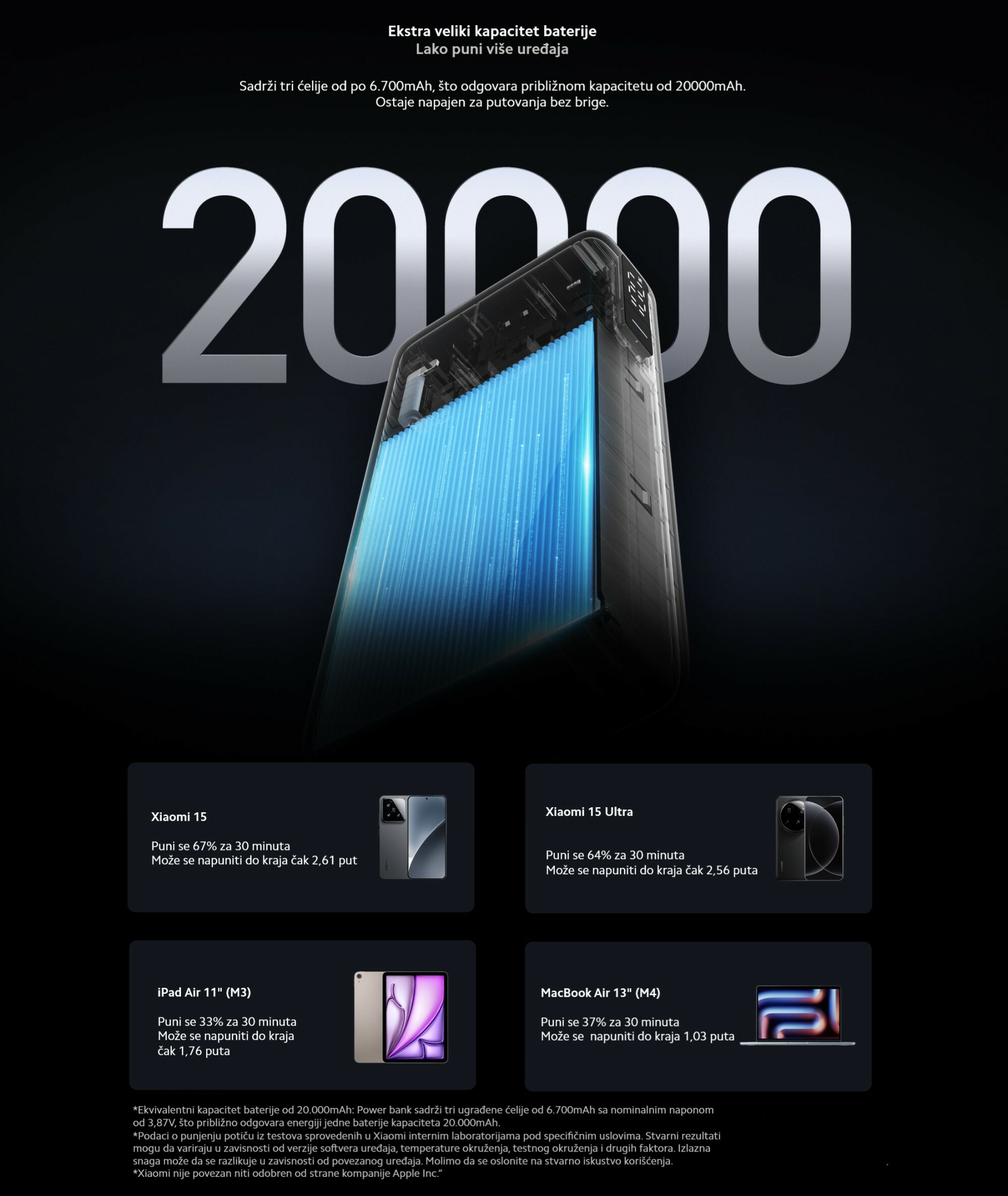 *Osim ako nije drugačije naznačeno, svi podaci potiču iz Xiaomi Internal Labs. Međutim, zbog varijacija u objektivnim faktorima kao što su verzije softvera, temperatura okoline, metode testiranja i korišćeni kablovi, stvarni rezultati mogu se razlikovati.