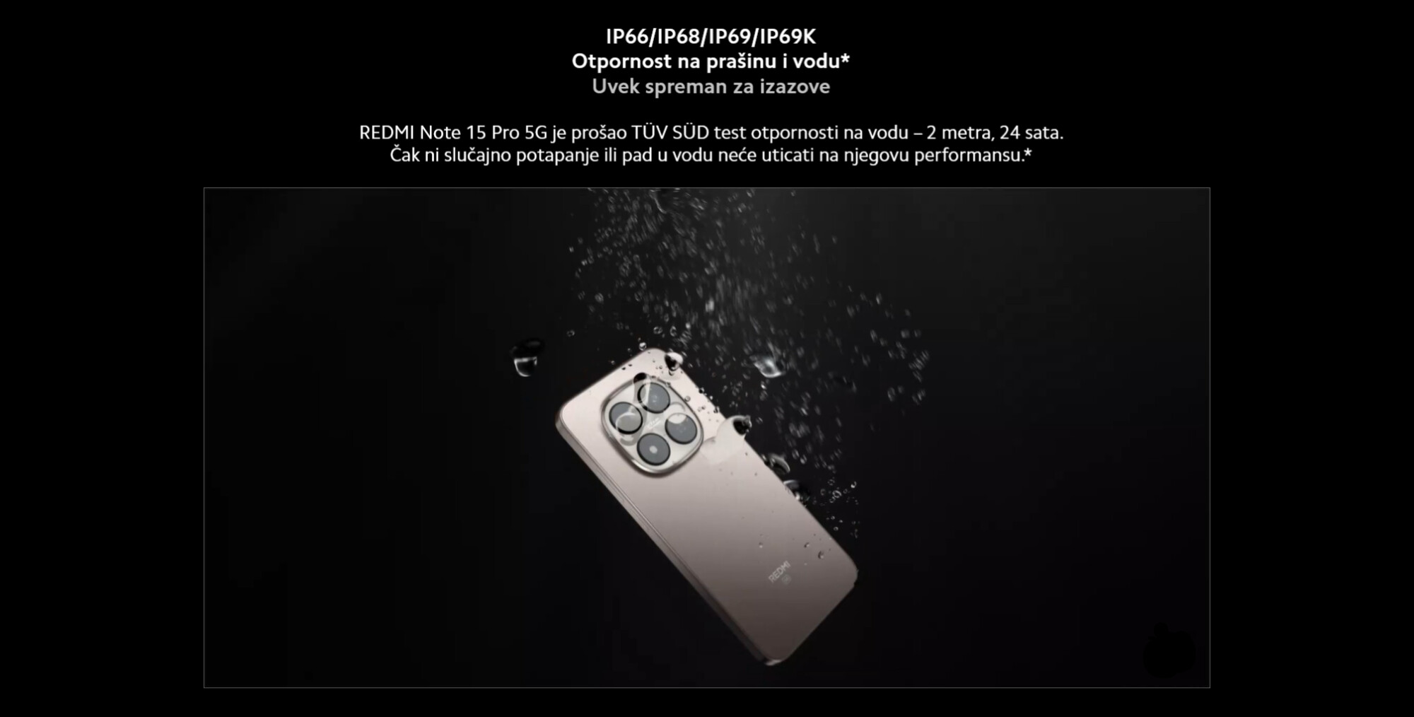 *Uređaj je sertifikovan kao otporan na vodu i prašinu isključivo pod specifičnim laboratorijskim uslovima koji ne odgovaraju normalnim uslovima upotrebe. Garancija ne pokriva oštećenja od tečnosti uzrokovana uslovima koji nisu uslovi testiranja. Zaštita od prodora može se pogoršati usled habanja, fizičkog oštećenja i/ili rastavljanja potrebnog za popravku. Za više informacija posetite zvaničnu veb stranicu Xiaomi.