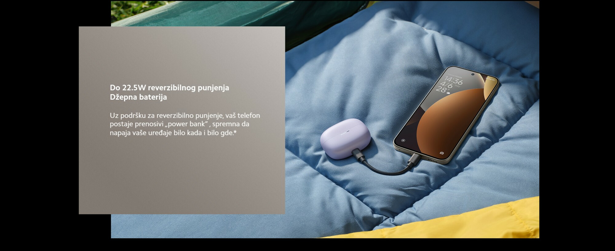 *Podržava žično reverzno punjenje do 22,5 W, kompatibilno sa uređajima verifikovanim putem testiranja Xiaomi Internal Labs. Stvarne performanse mogu varirati u zavisnosti od stanja baterije i drugih faktora. Kada koristite ovu funkciju, uverite se da vaš telefon ima dovoljno baterije i proverite kompatibilnost prijemnog uređaja.