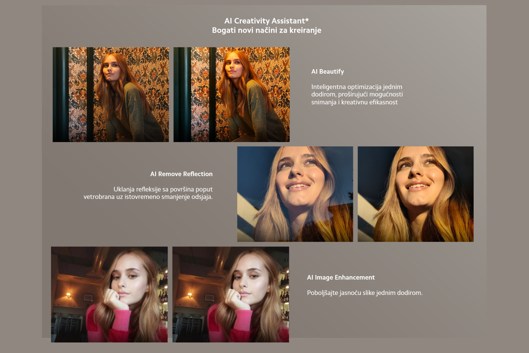*Neke od funkcija AI Creativity Assistant zahtevaju internet vezu i mogu se razlikovati u zavisnosti od sistemskog softvera i verzija aplikacije Gallery Editor. Pogledajte stvarno iskustvo upotrebe.