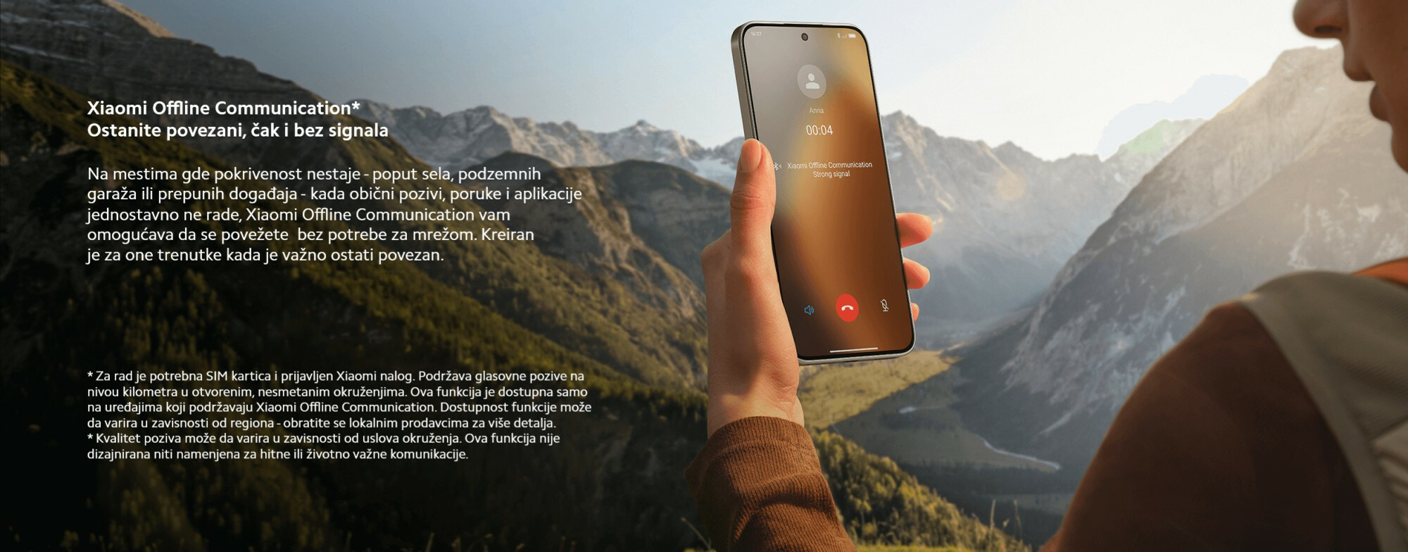 *Xiaomi Offline Communication zahteva SIM karticu i prijavljeni Xiaomi nalog da bi funkcionisao. Podržava glasovne pozive na kilometrima u otvorenim, neometanim okruženjima. Ova funkcija je dostupna samo za uređaje koji podržavaju Xiaomi Offline Communication. Dostupnost funkcije može varirati u zavisnosti od regiona, za više detalja obratite se lokalnim prodavcima.