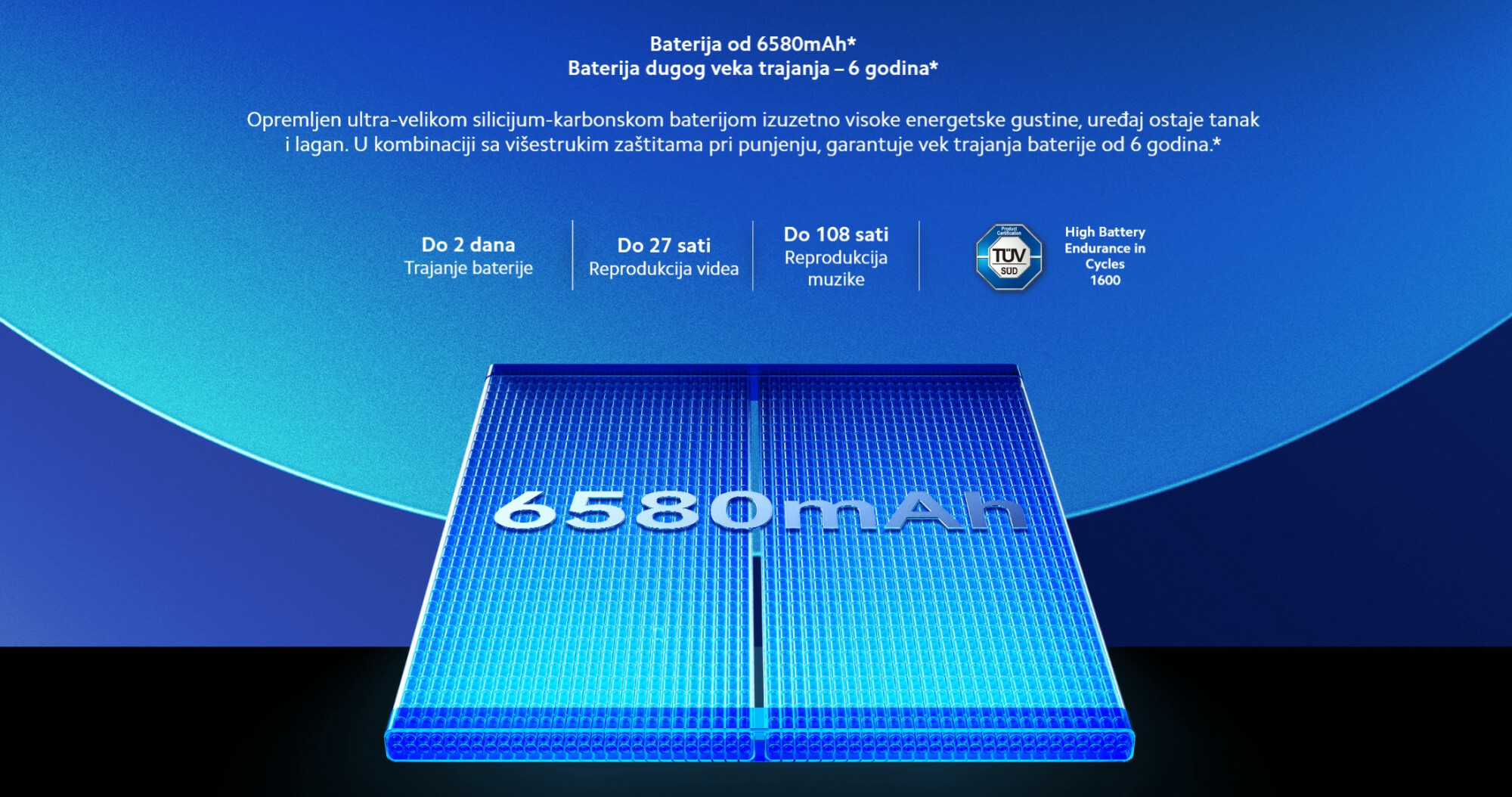 *Ovo je iz teorijskih proračuna zasnovanih na podacima testiranja Xiaomi Internal Labs. Simulirajte svakodnevne navike korisnika (jedno potpuno punjenje i pražnjenje svakih 1,5 dan). Preko 80% kapaciteta baterije se zadržava nakon 1600 kompletnih ciklusa punjenja, što odgovara preko 6 godina korišćenja. Stvarni rezultati mogu varirati u zavisnosti od uslova testiranja i navika korišćenja.