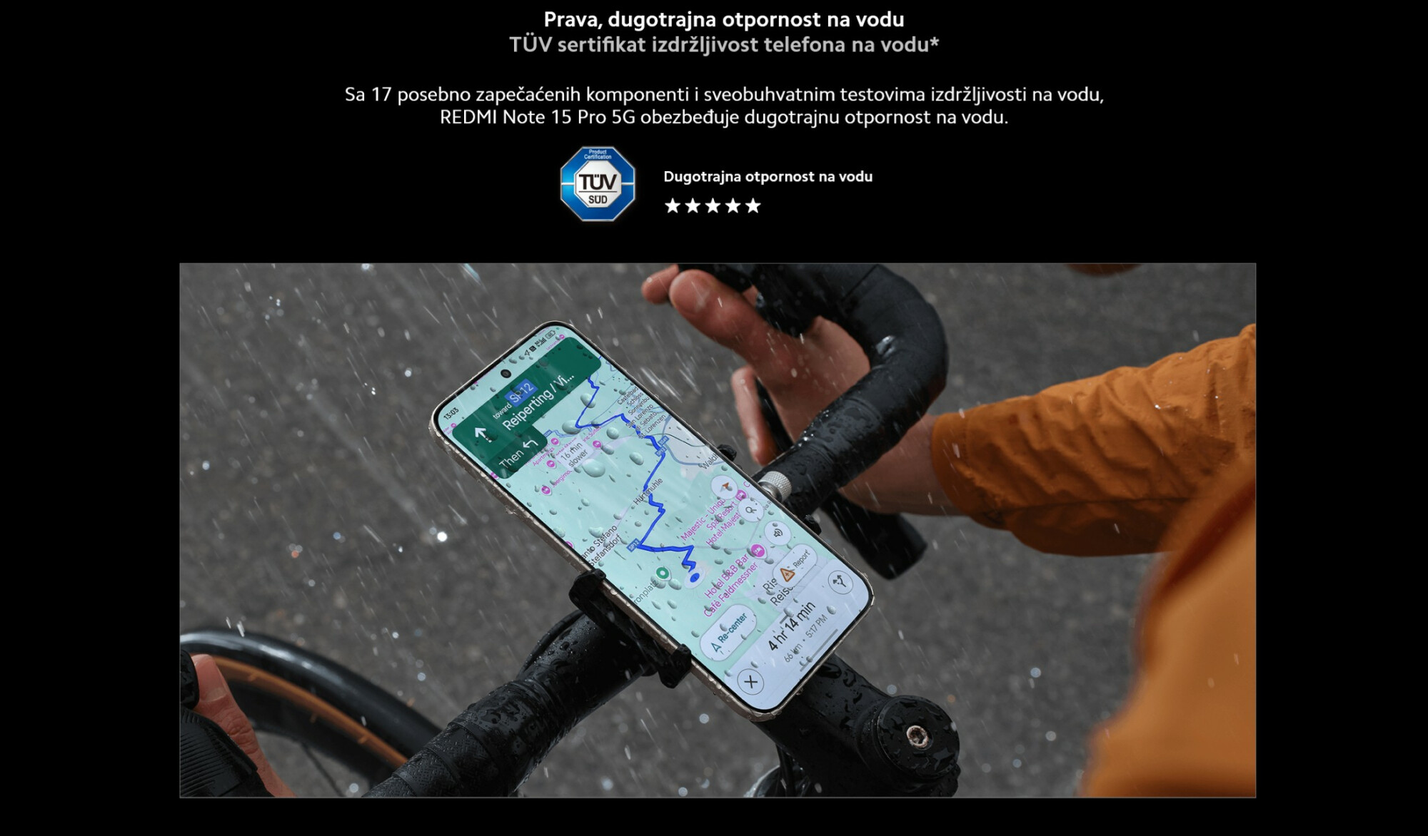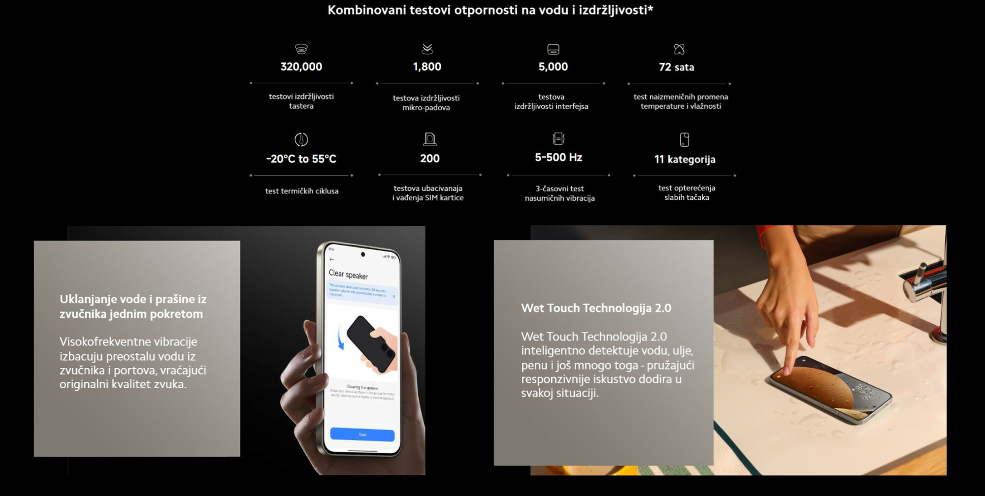 *Proizvod je prošao TÜV SÜD sertifikat za izdržljivost vodootpornih pametnih telefona, ispunjavajući 8 kategorija testova na osnovu standarda ispitivanja PPP: CCB05071A:2025. Broj sertifikata: Z2GCN 099551 0584 Rev.00. Ovaj proizvod nije profesionalni vodootporni uređaj. Njegova otpornost na vodu i prašinu nije trajna, a zaštitne performanse mogu se vremenom smanjiti zbog svakodnevnog habanja. Ne punite uređaj dok je mokar. Oštećenja uzrokovana potapanjem u tečnost nisu pokrivena garancijom.