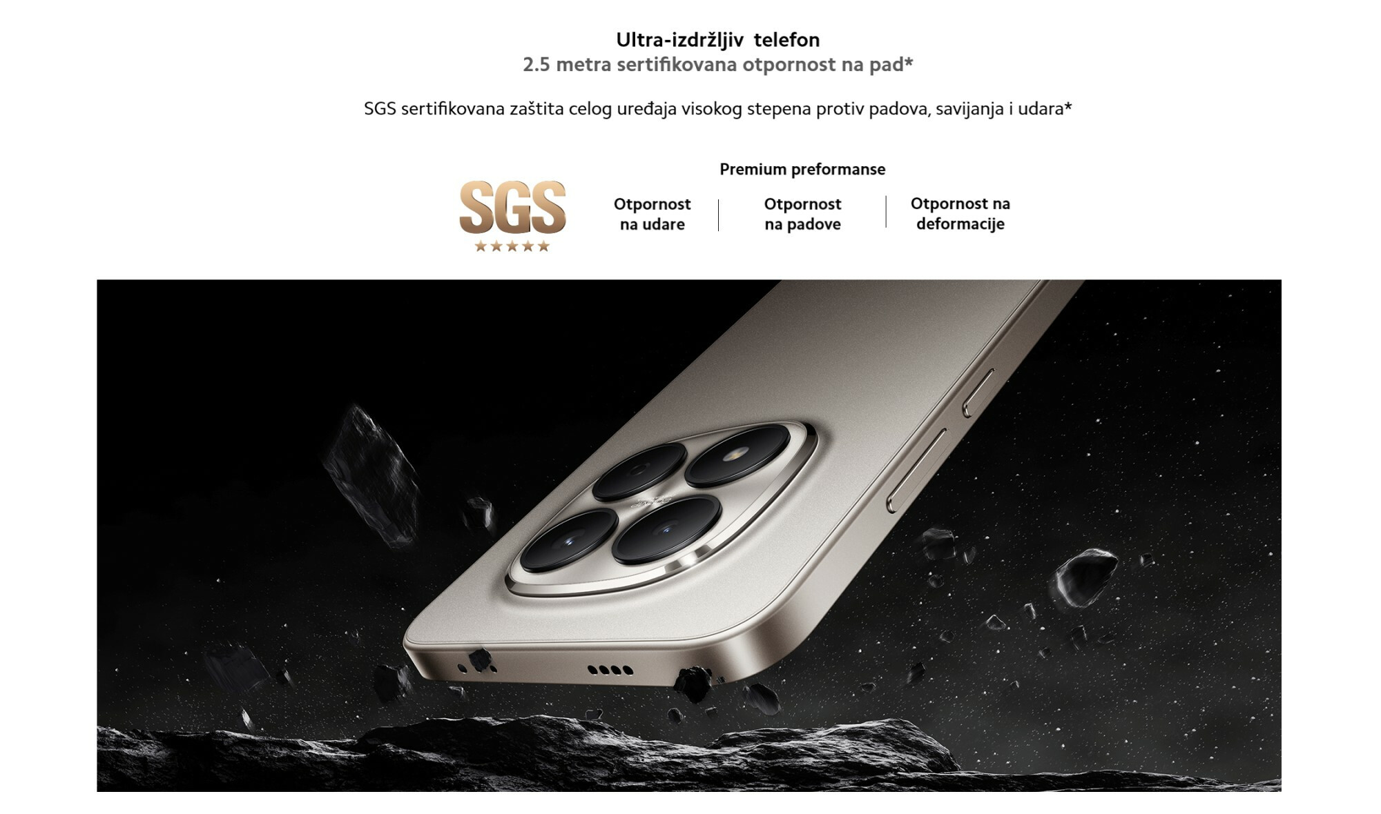 *Podaci o otpornosti na pad sa visine od 2,5 metra su sertifikovani od strane SGS-a. Telefon može da izdrži pad sa visine od 2,5 metra na glatku granitnu površinu pod SGS standardnim uslovima testiranja. Stvarni rezultati mogu da variraju. Kao precizan elektronski uređaj, telefon je i dalje u opasnosti od oštećenja u slučaju pada. Molimo vas da budete oprezni da biste izbegli padove i sudare.