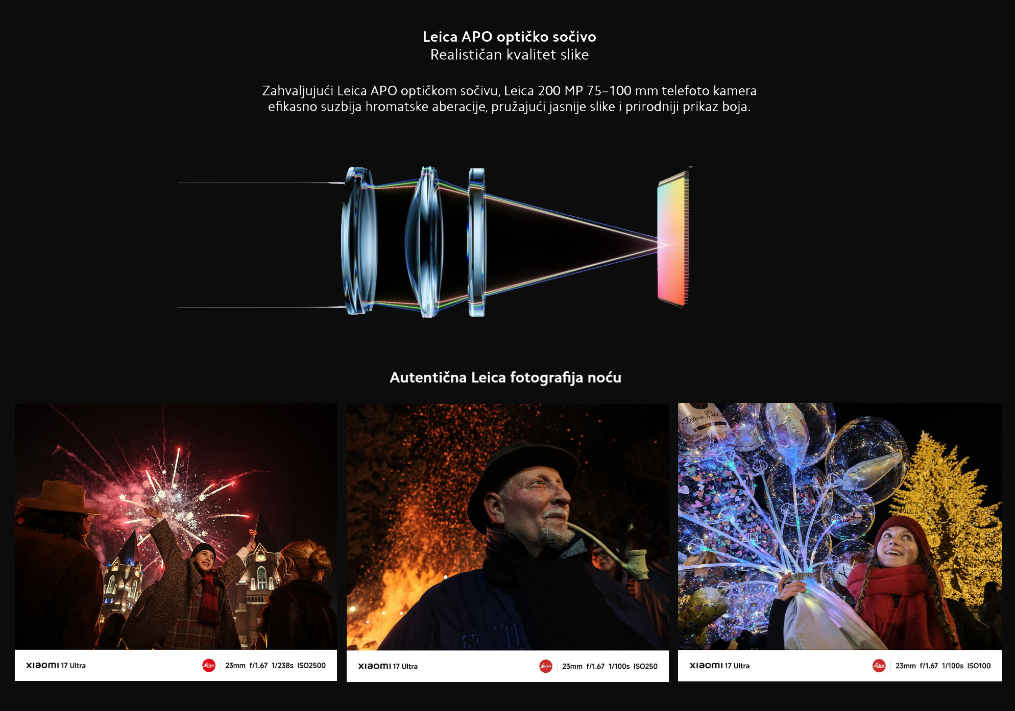 | Zadnja kamera | 50MP ƒ/1.67 OIS Leica 23 mm glavna kamera + 200MP f/2.39-f/2.96 OIS Leica 200 MP 75 - 100 mm telefoto + 50MP f/2.2 Leica 14 mm ultraširoka kamera (FOV) 115° |