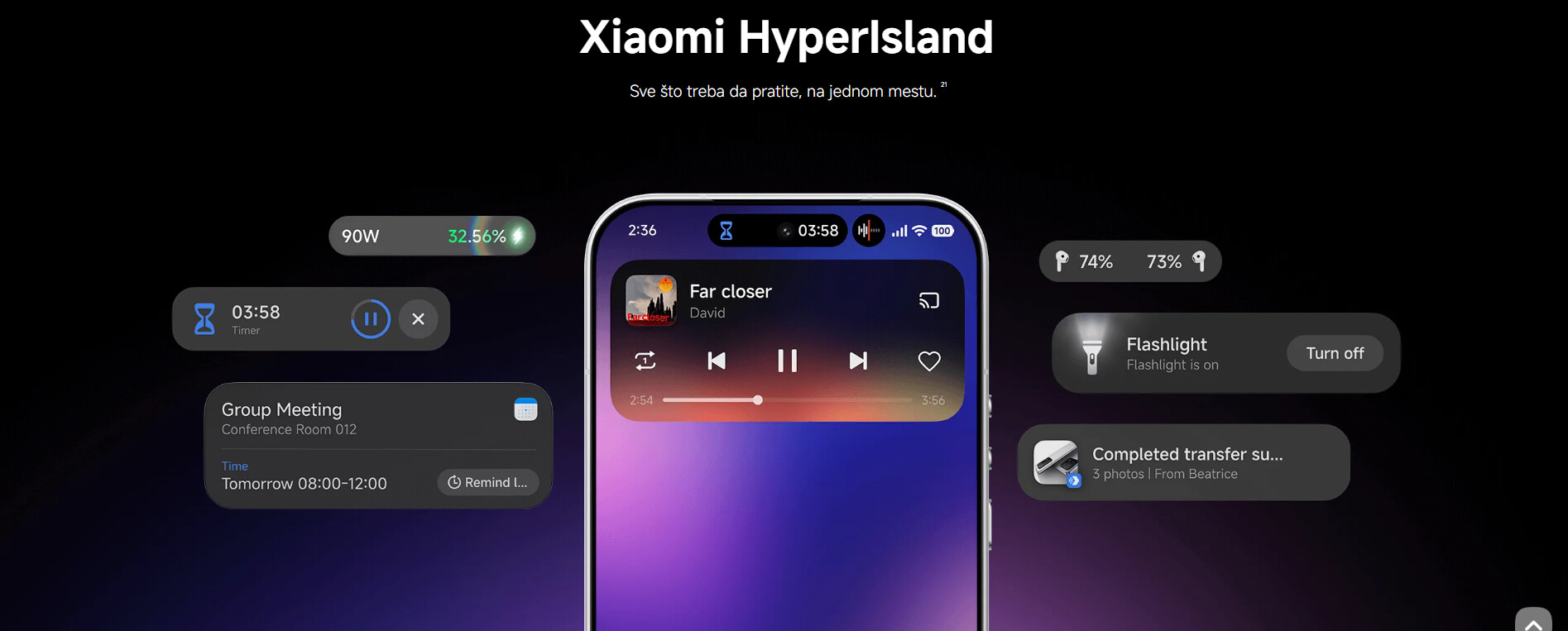 *Xiaomi HyperIsland je trenutno dostupan u odabranim aplikacijama. Dostupnost pojedinih funkcija i usluga može varirati u zavisnosti od verzije softvera, aplikacija, regiona i modela uređaja. Molimo vas da se oslonite na stvarnu upotrebu.