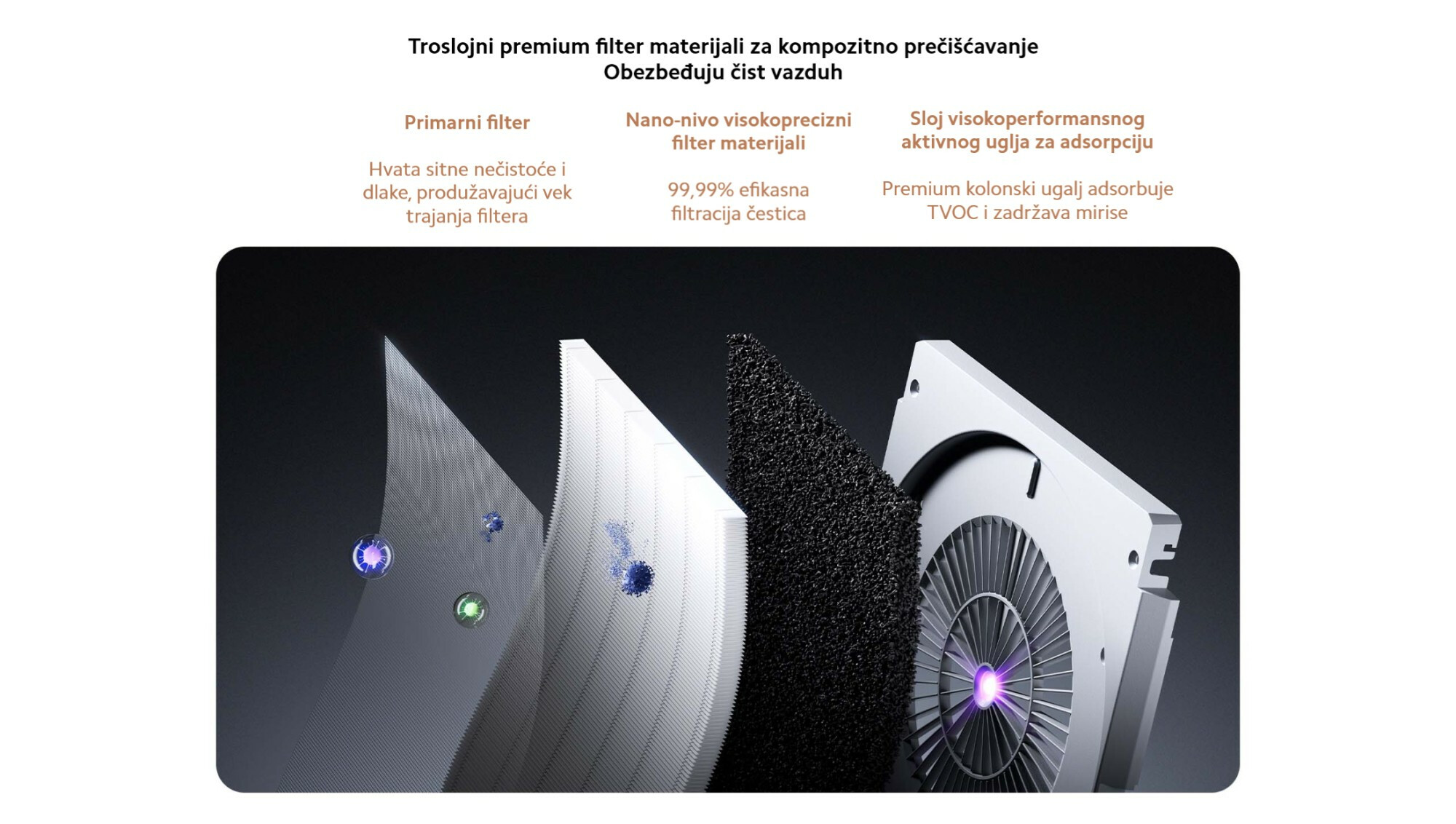 *99,99% Efikasna filtracija čestica: Odnosi se na brzinu uklanjanja od 99,99% za PM1, PM2,5 i PM10 za 1 sat. Podaci potiču iz Nacionalnog centra za inspekciju kvaliteta i ispitivanje proizvoda za prečišćavanje vazduha kompanije Guangzhou Institute of Microbiology Group Co., Ltd. Broj izveštaja o ispitivanju: KJ2025002550E.