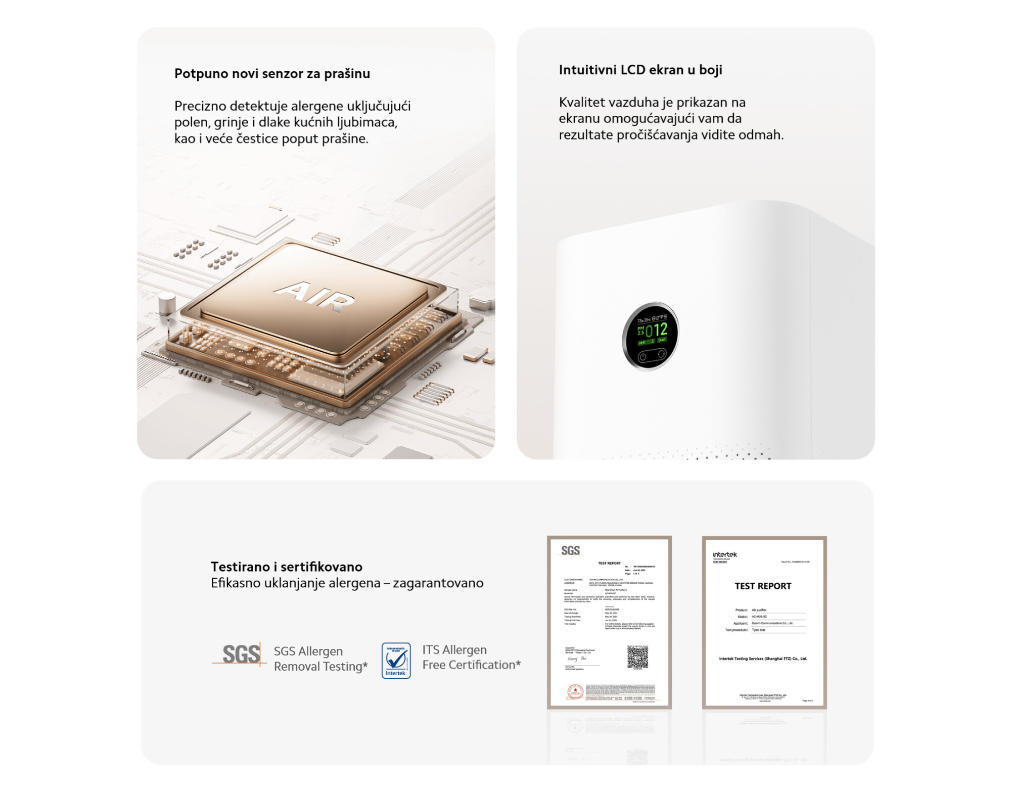 *99,31% brzina uklanjanja alergena mačje peruti za 1 sat: Podaci potiču od SGS-CSTC Standards Technical Services (Tijenđin) Co., Ltd. Broj izveštaja: RSTSQD250620000102.